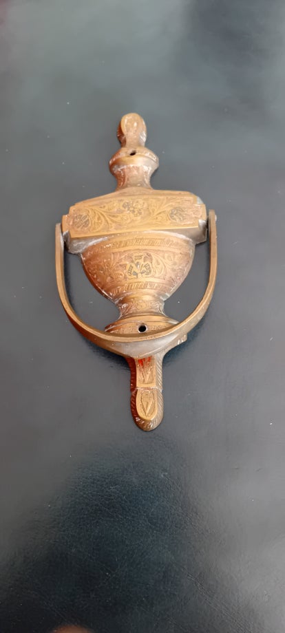 A stylish ornate door knocker, I have never tried to polish it as I like its old patina look but the choice is yours. It has two holes for door attachment, but does NOT come with screws easy to buy from your local DIY shop. In used condition with some wear consistent to its age and use. See photos to make your own assessment of condition.