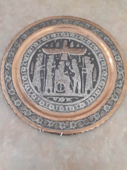 Beautiful Plate/Tray with ornate design and what may be persian men in the centre of plate.Very strong and weighs in at 3lbs. In used condition does have some wear on the gold/copper effect surround, in my opinion adds to its patina. See photos to make your own assessment of condition.