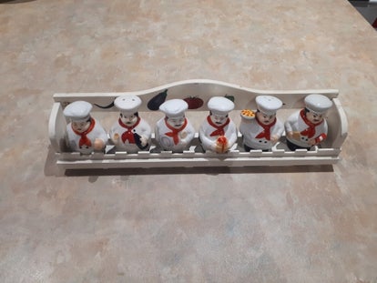 ⁸6 Very nice pots. Two are used as salt and pepper the others are for storage. The 4 storage pots, take off chefs hat empty contents inside. Comes with a wooden storage rack with holes for wall mounting if necessary. In used condition, one of the chefs hat is a bit loose, the wooden rack shows signs of wear. Overall a nice addition to your kitchen. See photos to make your own assessment of condition.