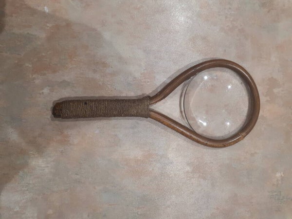 - Lovely vintage magnifying glass with a rope binding handle. Not sure if its wood or bamboo construction, good magnification to it. In used condition with some minor wear/splitting of wood on the surround but still sturdy. See photos to make your own assessment of condition.