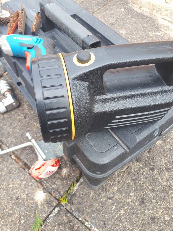 - Large used tool box, Spanners, Hacksaw, blade a lttle blunt, 2 Spark plug extractors Rusty ruler with spirit level attached, Utility fold in screw drivers and extras, Wire drill brush, Drill chuck, 2 drill ends, Metal clamp,Small plyers, Torch no battery sold as UNTESTED, Ferrex drill no charger sold as UNTESTED, Hand drill wood split in centre Sold as UNTESTED and Staple gun Sold as UNTESTED.