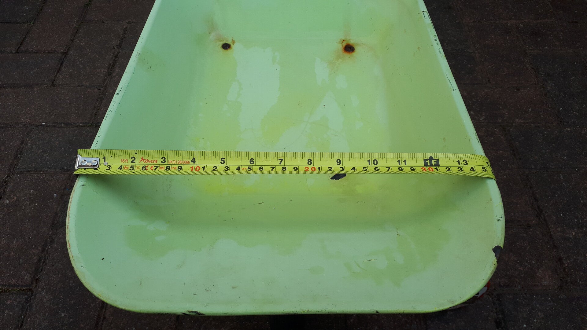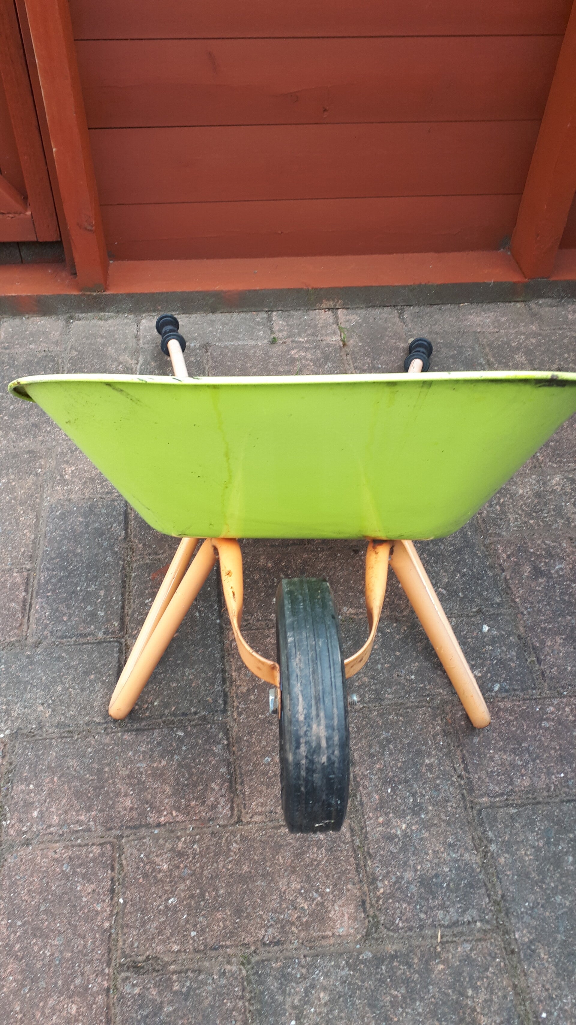 In used condition a few minor rust spots, ideal for garden decoration or letting the kids have there own barrow helping mum/dad in the garden. See photos to make your own assessment of condition.
