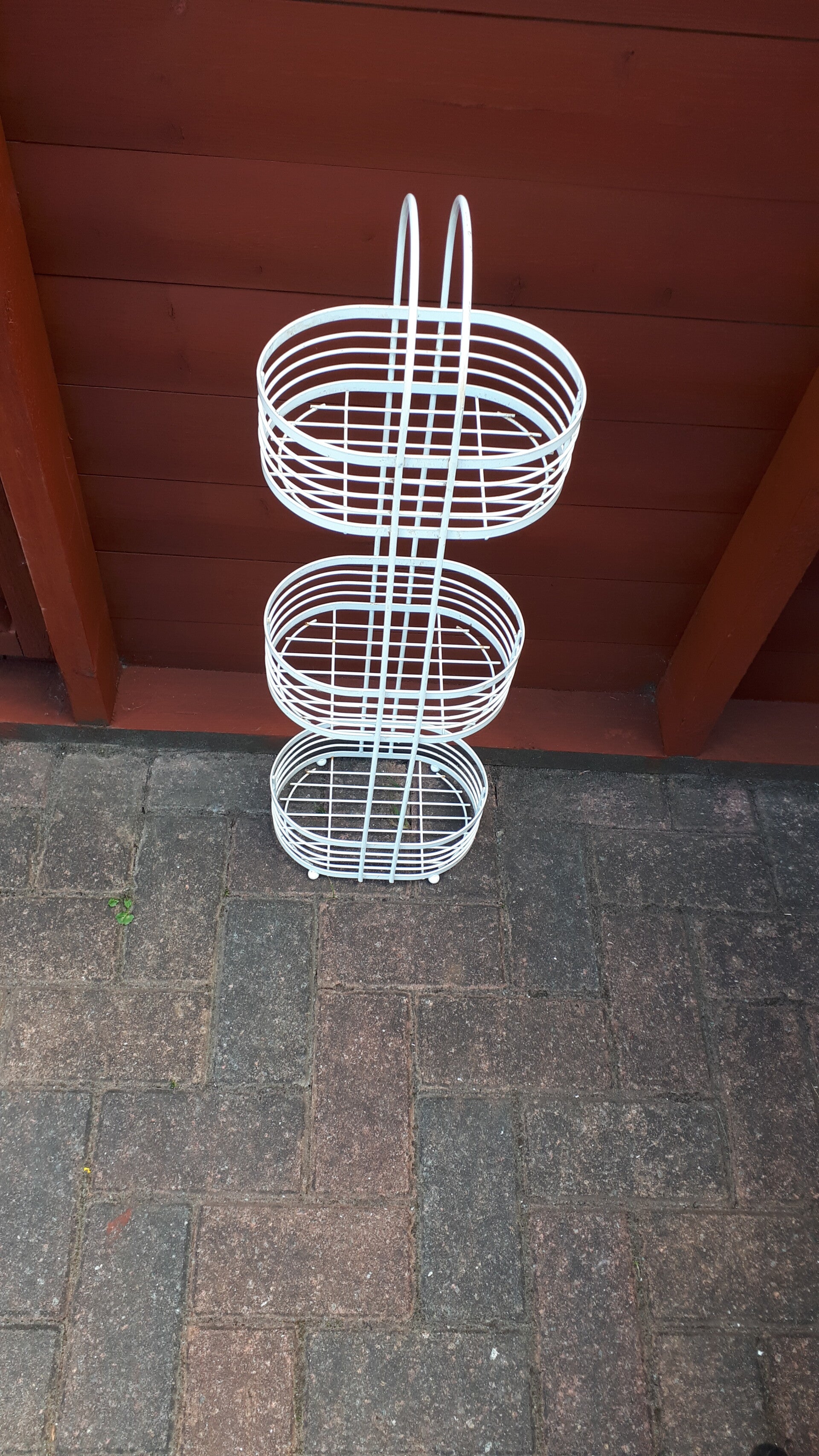 Super item can be free standing or wall mounted. Use in the garden or in your home ideal for plants or even bathroom accessories. In good used condition with minor wear/rust spots from outside use nothing a coat of paint won't rectify.