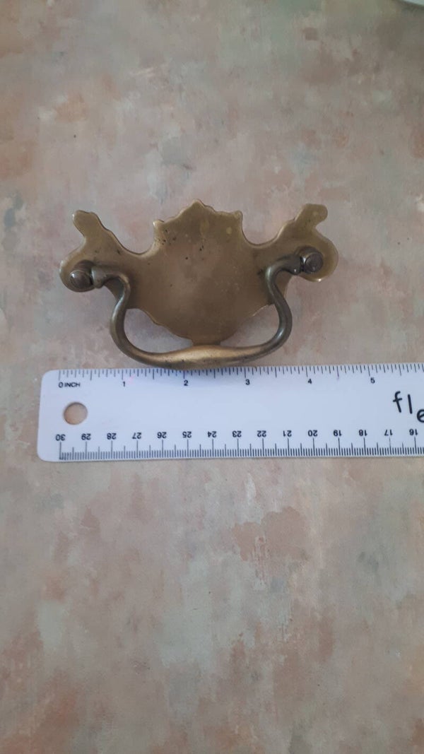 Can be used for doors as a knocker or perhaps cabinet handles the choice is yours. Placed on wooden batten to show how it would be fitted. Would take batten of for shipment. In used condition showing signs of wear consistent to its age and use. Never tryed to clean the brass I like to keep its old patina but the choice is yours.