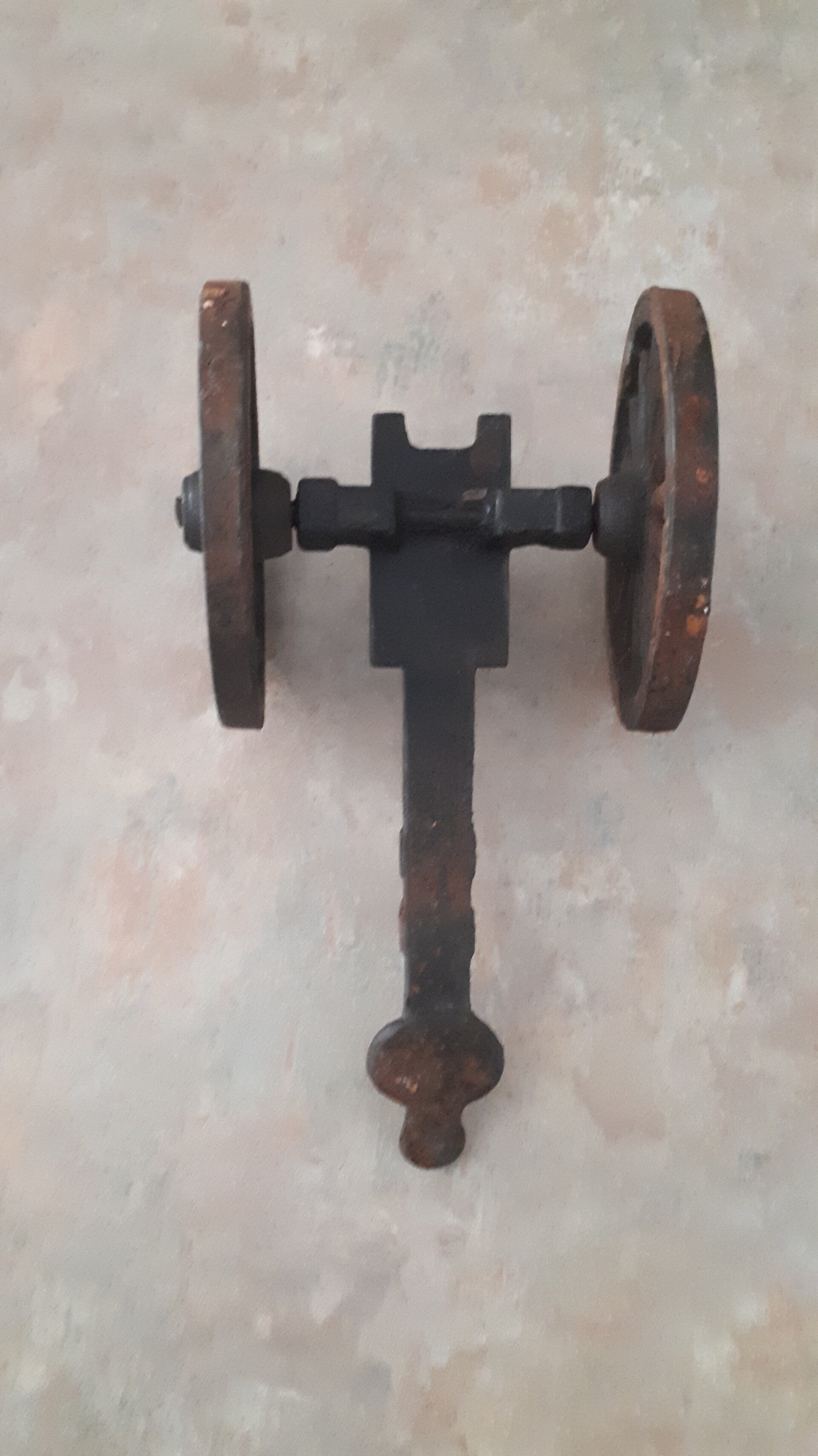 - Sturdy and strong weighs in at nearly 2lbs. The cannon is brass and detachable, the gun carriage I believe is wrought iron as it is magnetic but not 100% sure. There are rust spots on the carriage never tried to clean as i like its old patina but the choice is yours. Both wheels move freely. In used condition see photos for your assessment of condition.