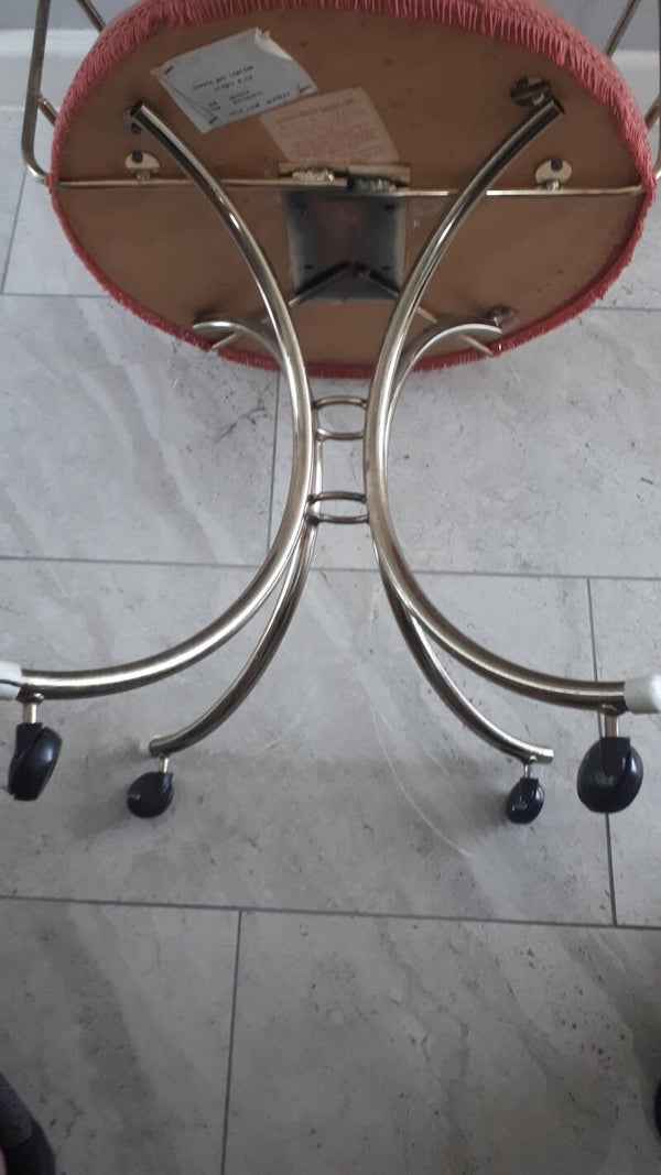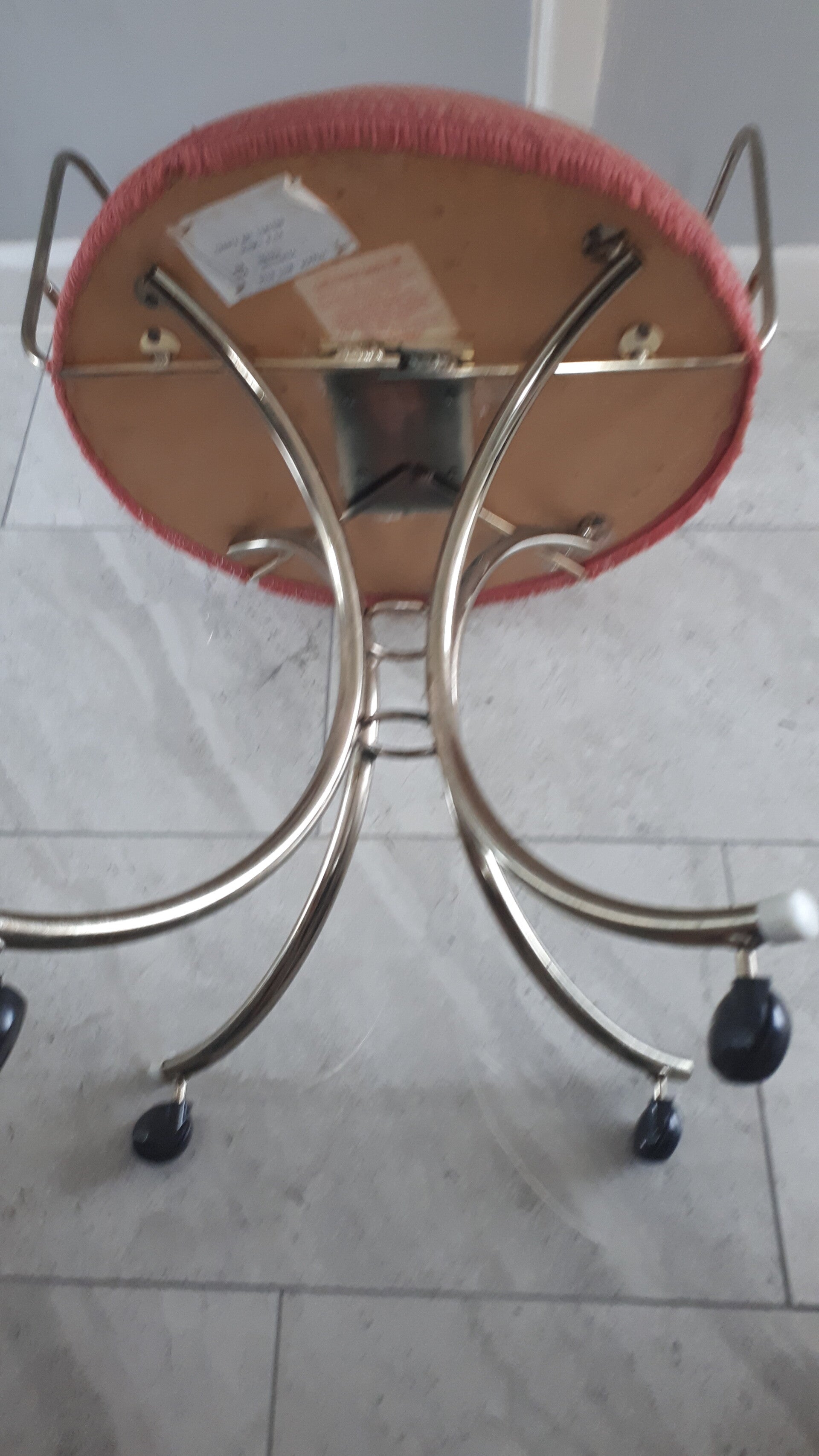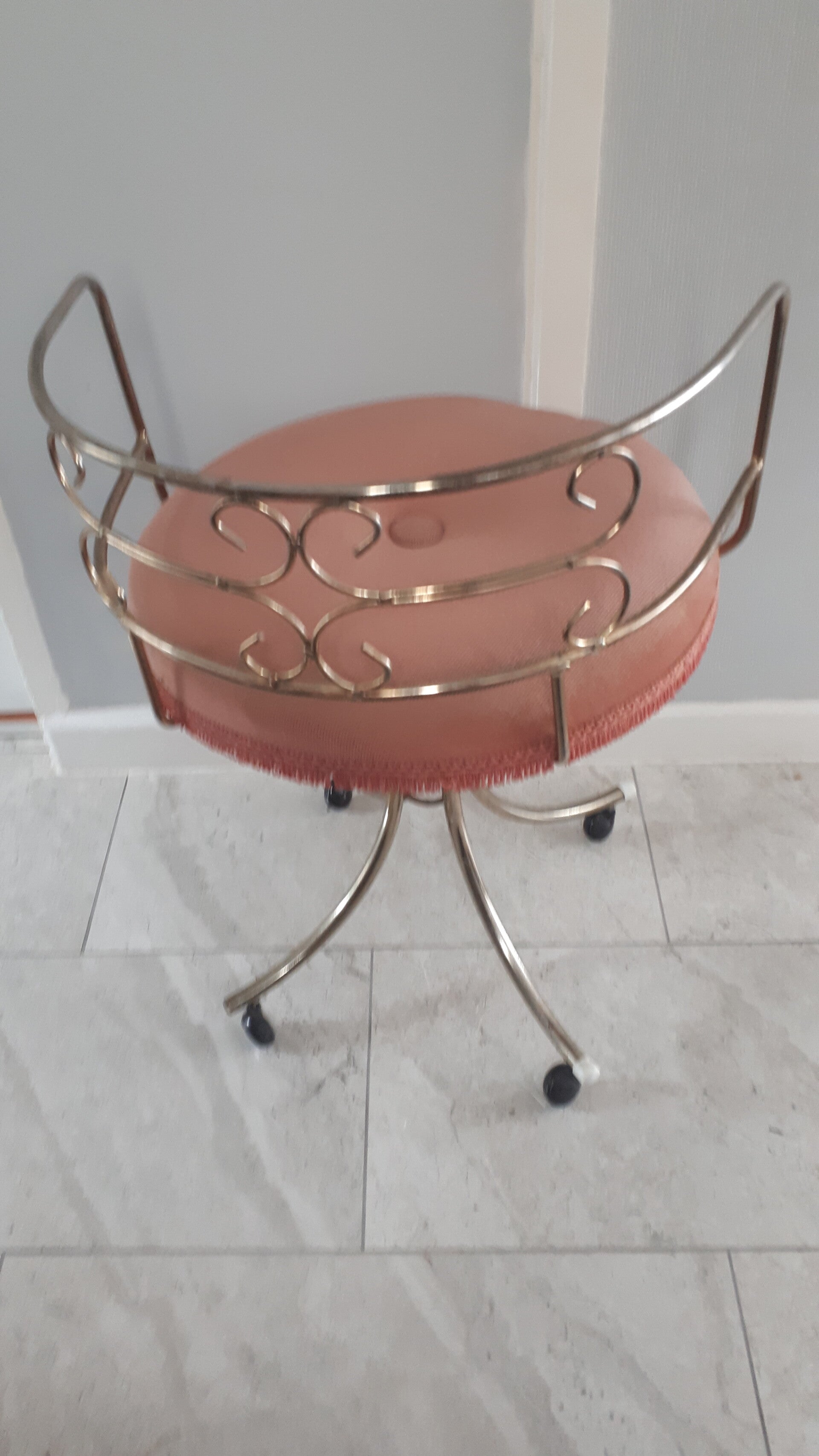 - Retro/Vintage boudoir chair on on castors with chrome frame, 4 castor wheels and soft pink cushioned seat with tassels, .The chrome does need some TLC to bring back to it former glory. One white rubber end piece is missing from leg. In used condition see photos for your assessment.