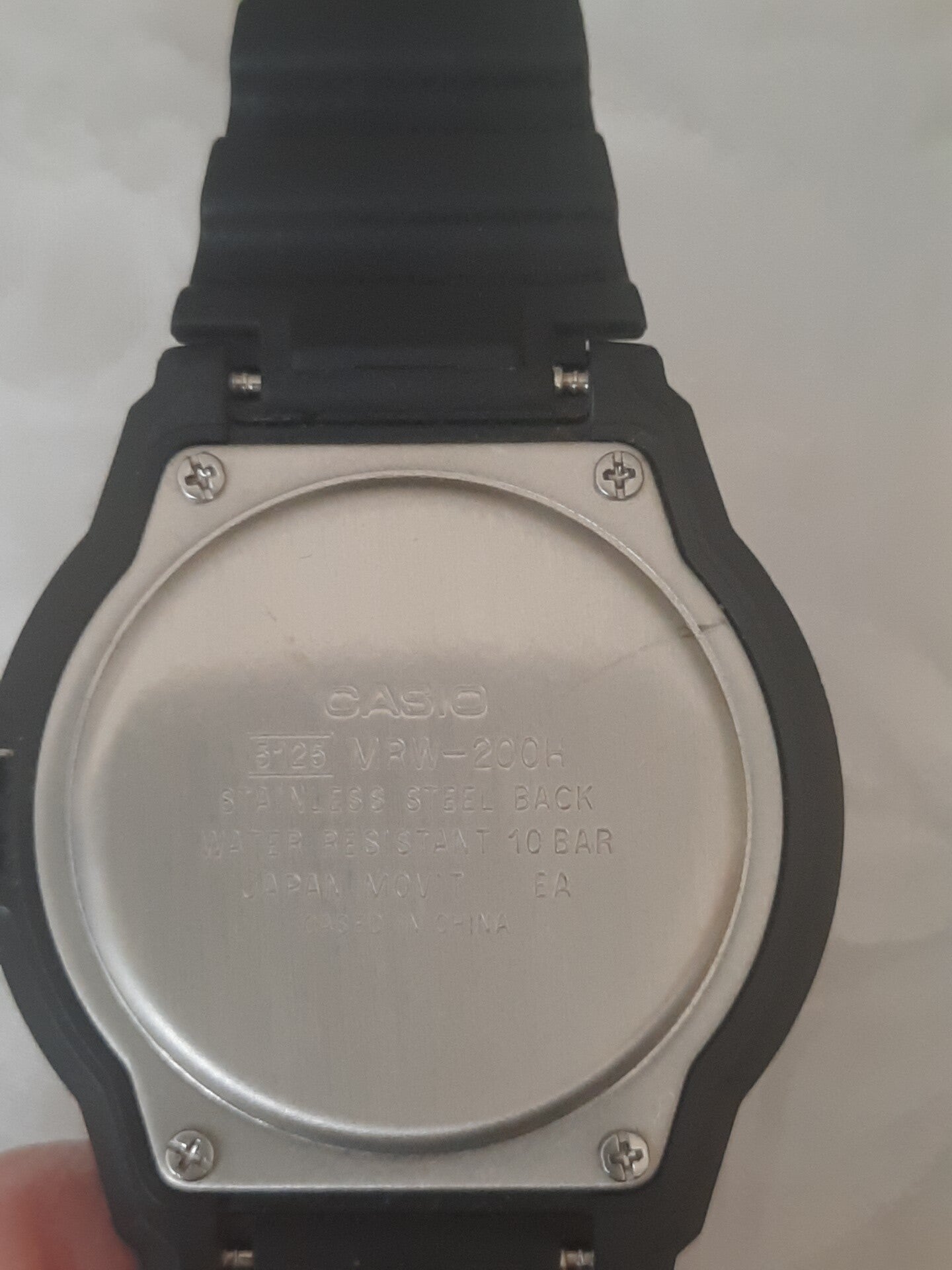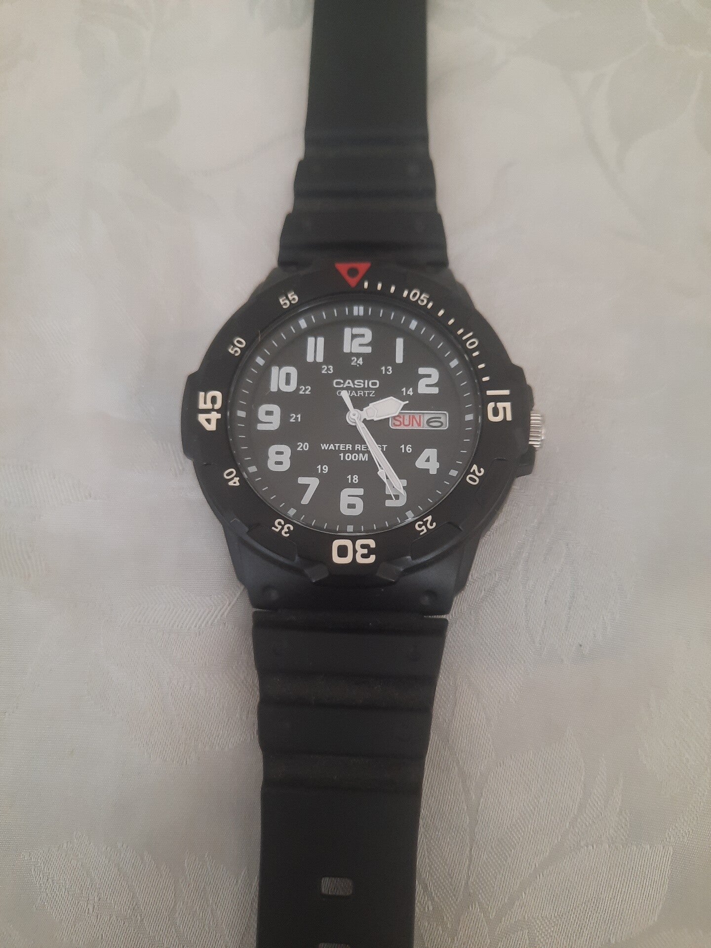 - This is a slightly used Casio MRW-200H with day and date like new . It works very well and has new battery in it. It is comfortable and the arms are luminescent in the dark with even a little sun . Works great . Shows the day in 2 languages . English and Spanish with the date beside it. Works fabulously. Have a look at the pictures, then take it home!!!🙂🙂🙂🙂🙂
