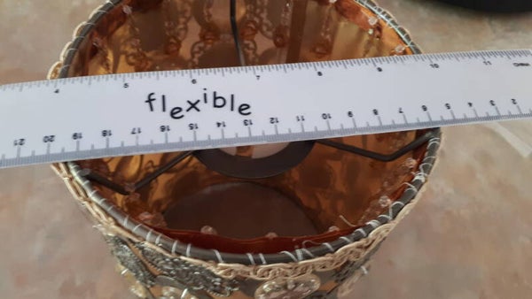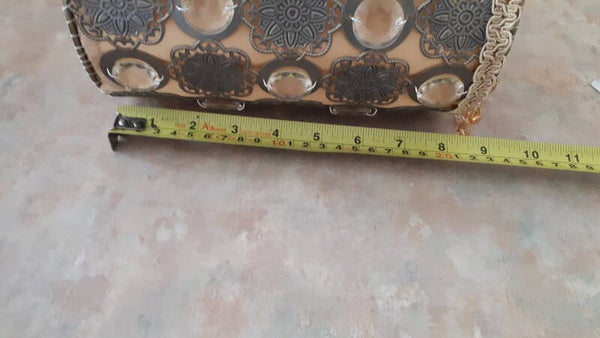 - Beautiful light shade with glass like beads and ornate tin/metal designs around the light shade. The metal frame has gold coloured canvas draped around it and attached with white cotton, some of the threads have come a lttle loose. At the bottom of the light shade are very nice dangling beads. In good used condition with some minor wear consistent to its age and use. See photos to make your own assessment of condition