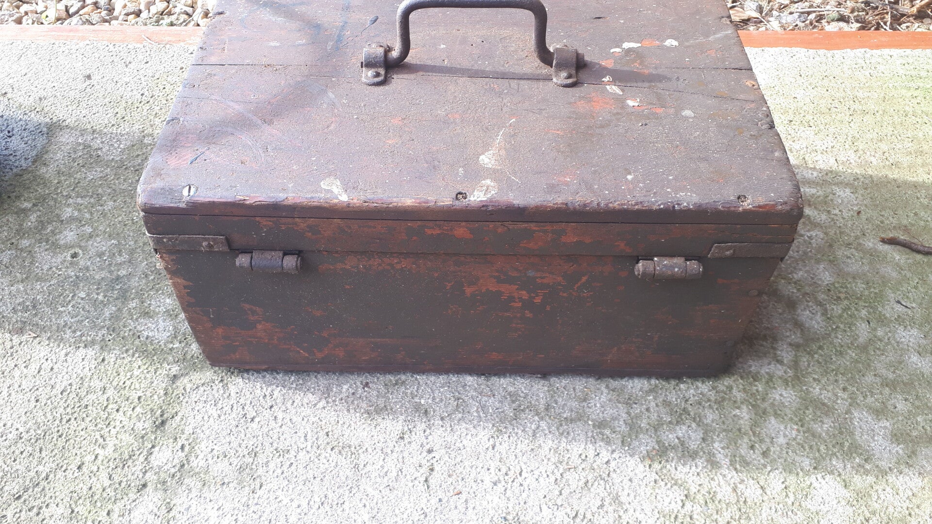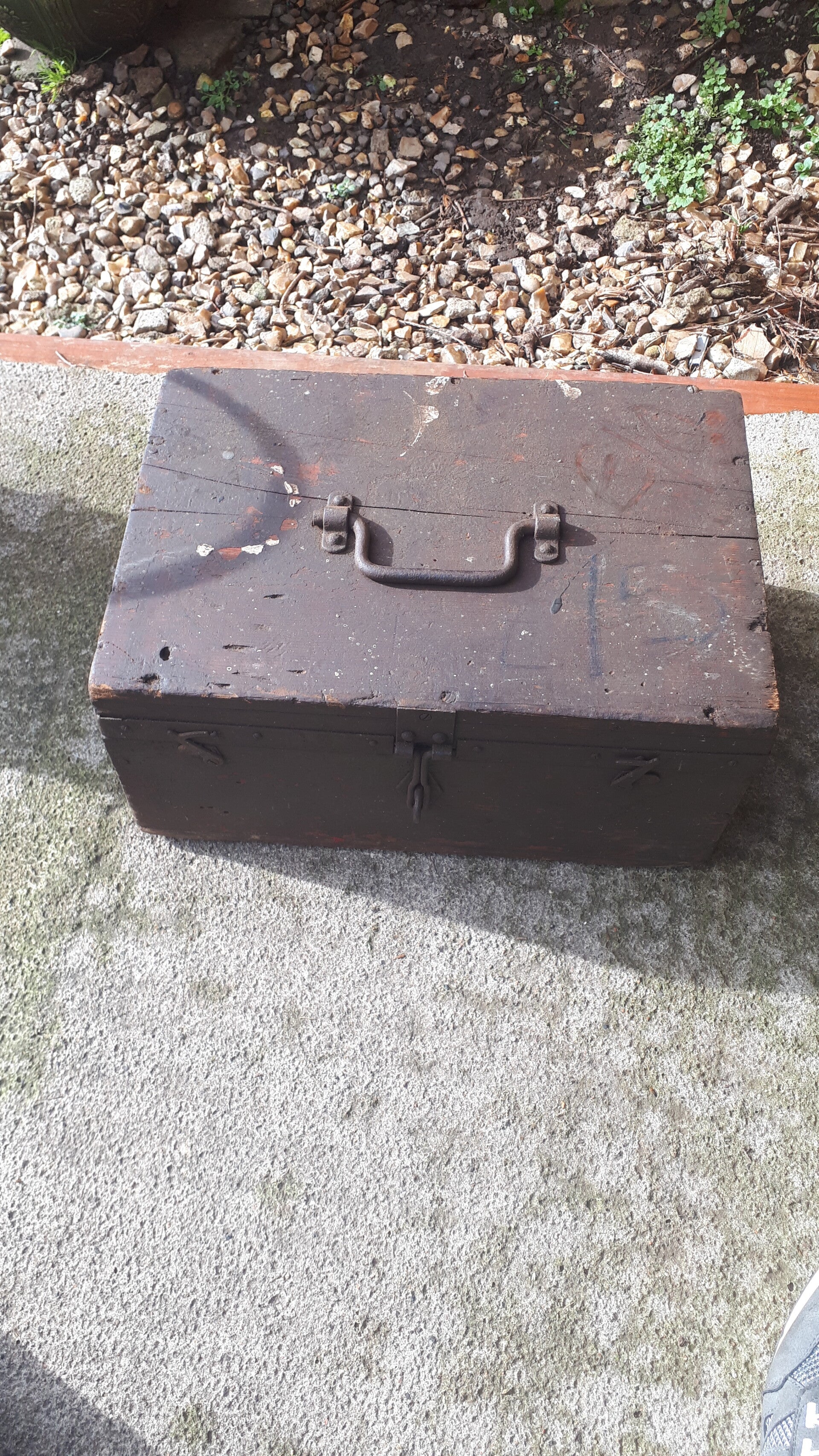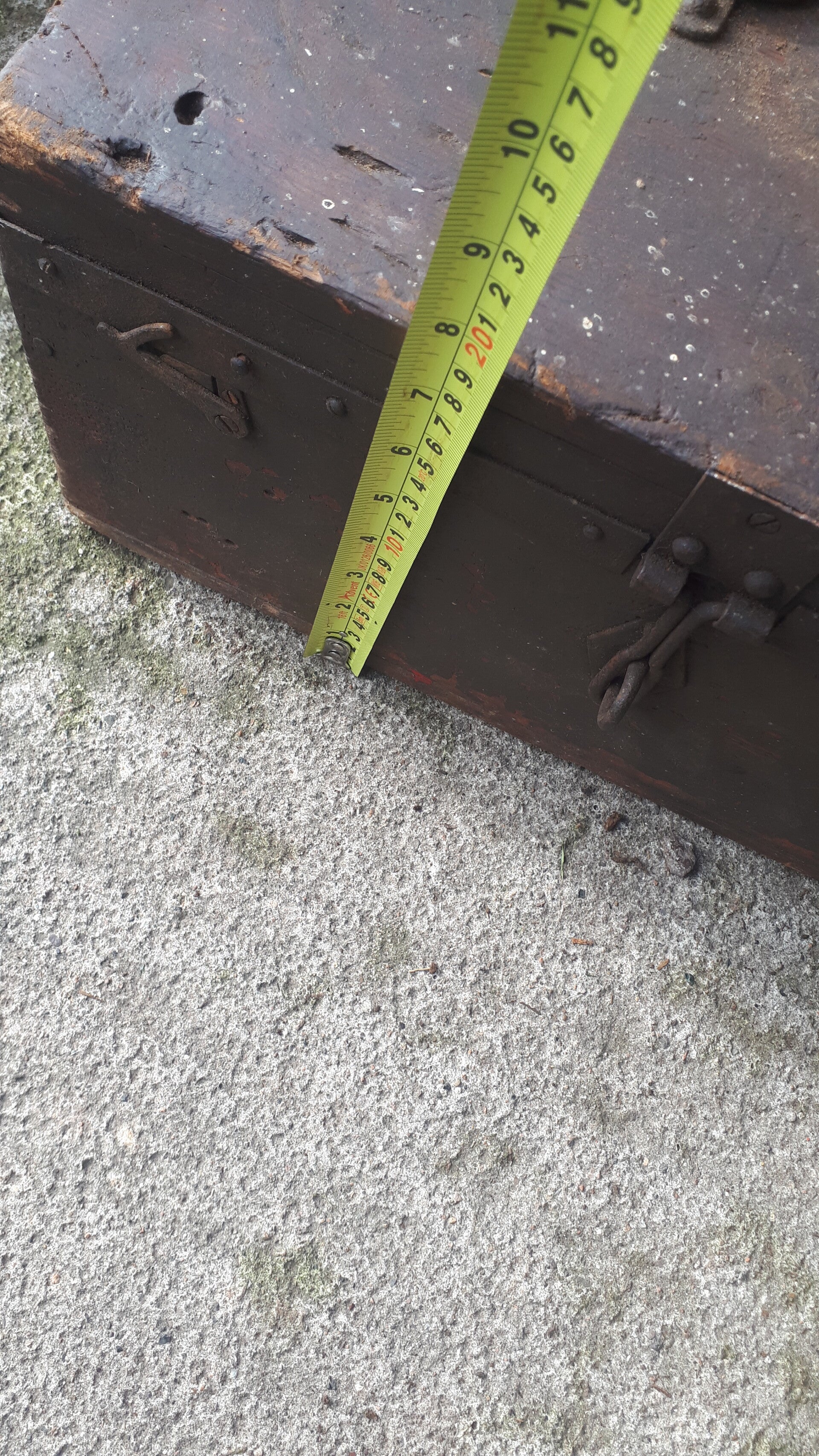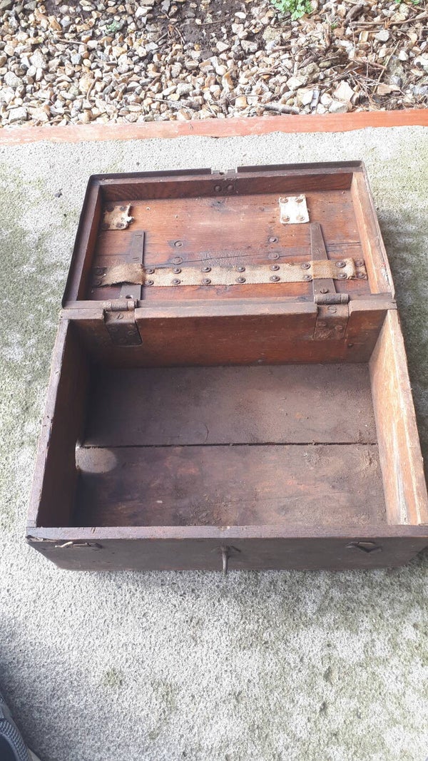 Found in the garden of a house clearance sale still drying out but the box is structurally sound. Has a metal band around it, metal/iron top carry handle wth front locking clasp and two side lid holders. Could be used as a functional storage box or with some upcycling an attractive home decoration. In used condition with wear from age and use. There are two holes in the one side dont really know what they were used for. See photos to make your own assessment of condition.