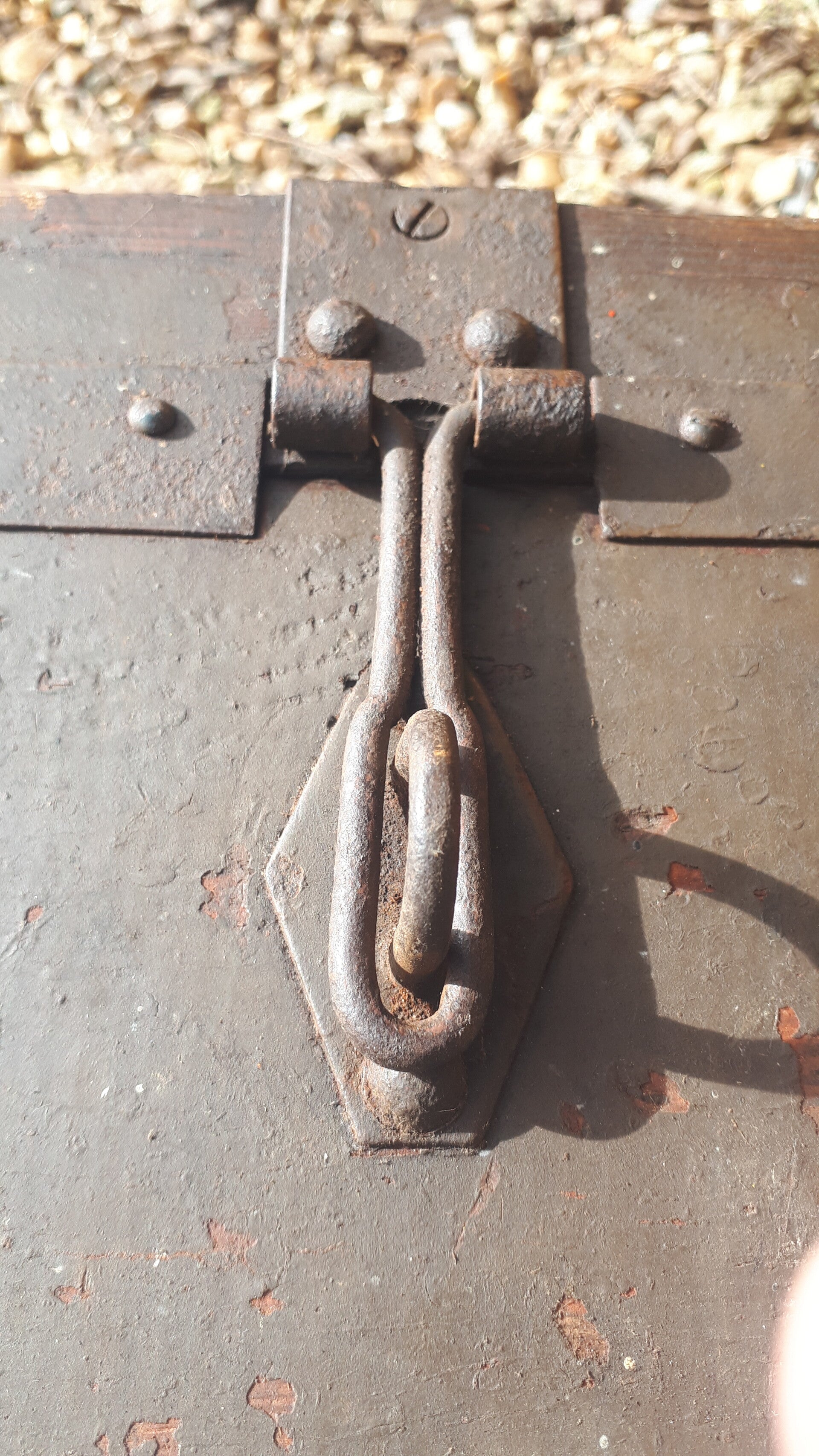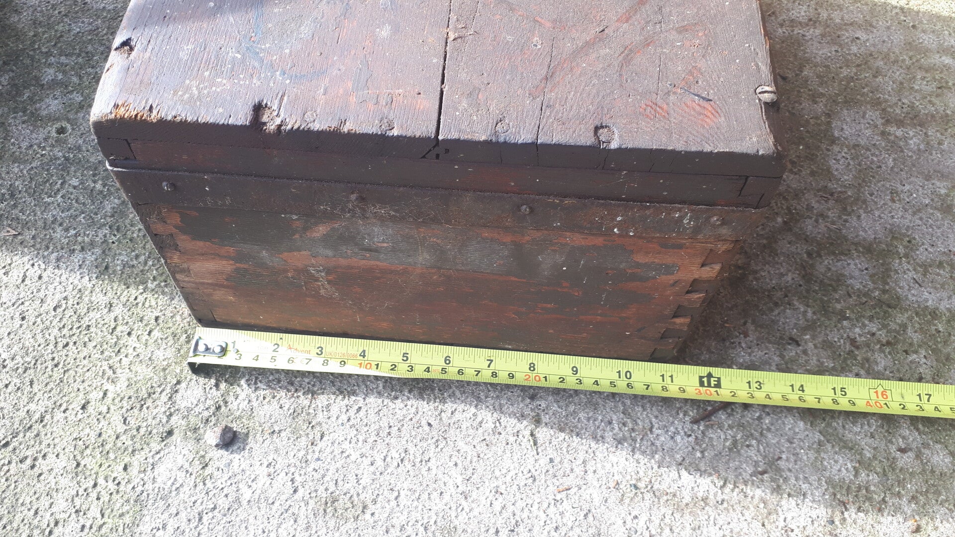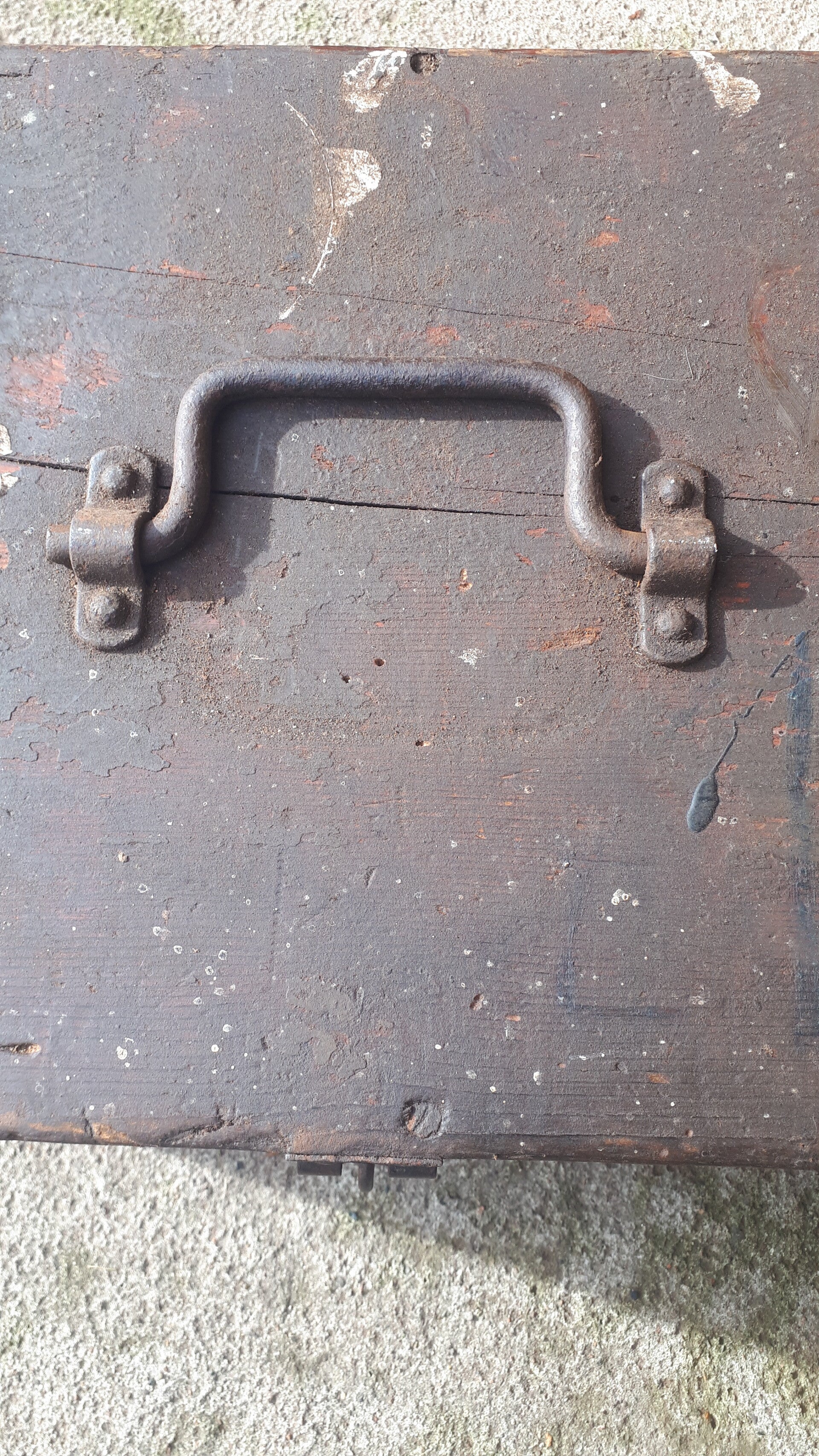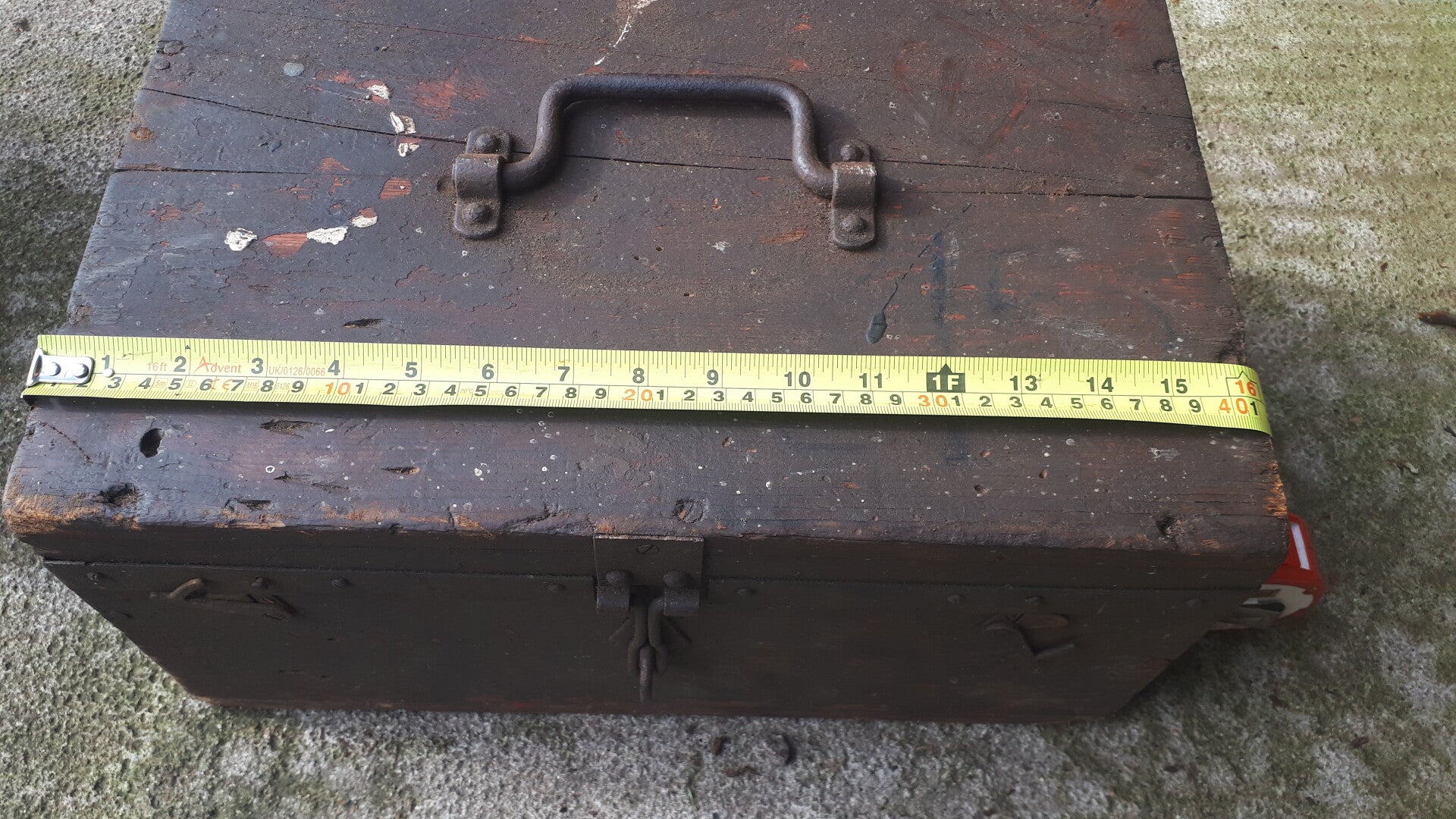 Found in the garden of a house clearance sale still drying out but the box is structurally sound. Has a metal band around it, metal/iron top carry handle wth front locking clasp and two side lid holders. Could be used as a functional storage box or with some upcycling an attractive home decoration. In used condition with wear from age and use. There are two holes in the one side dont really know what they were used for. See photos to make your own assessment of condition.