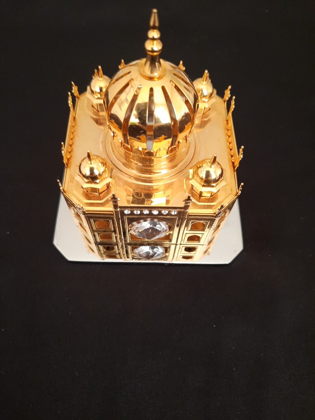 - This is a Crystal Temptations Taj Mahal figurine. It's gorgeous and look beautiful nomatter where you put it. It has 6 small Swarovski crystals on each side of it and 1 larger Swarovski crystal on each side as well. It also has a mirror bottom that reflects the piece above . There's a felt on the bottom . I believe it's 24k gold plated but I don't have the tag . Have a look at the pictures , then take it home !!!🙂🙂🙂🙂🙂UK POSTAGE ONLY!!!