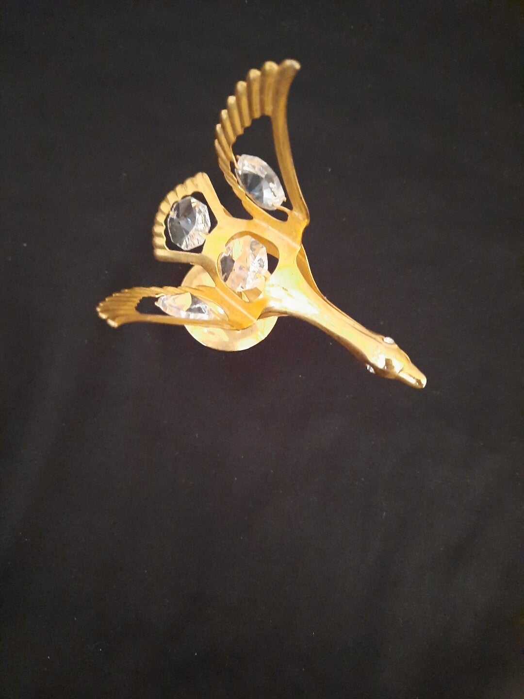 This is a used and in good condition Bird in flight . I believe it is 24k gold plated but I don't have the tag. It has 2 small Swarovski crystals for its eyes and 4 large crystals on its wings and back . It is also rotatable. You can put it in different positions . It's very beautiful. Have a look at the pictures below , then take it home .