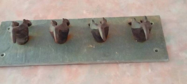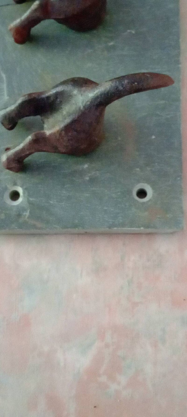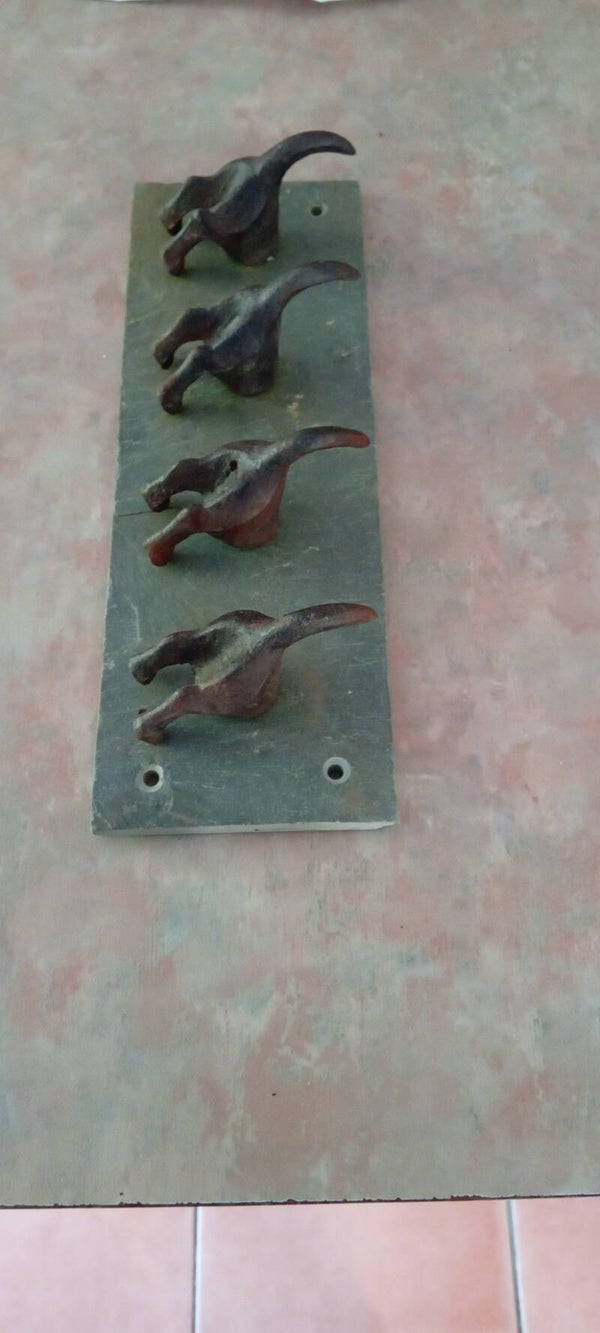 This quirky set of four dogtail hooks mounted on heavy quality slate, ideal for kitchen, hallways etc. Four sturdy wrought iron hooks, suitable for keys, coats, dog leads, or whatever you choose it for. In good used condition. See photos to make your own assessment.