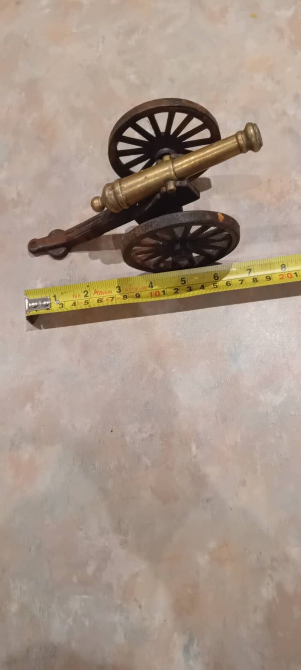 Vintage brass model cannon and metal/wrought iron carriage. Uk Postage Only