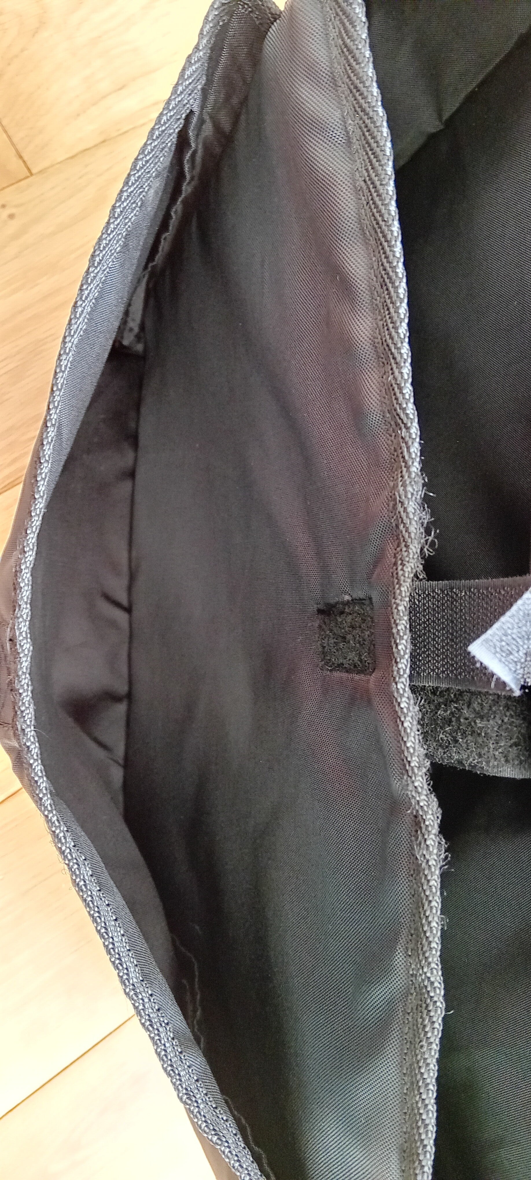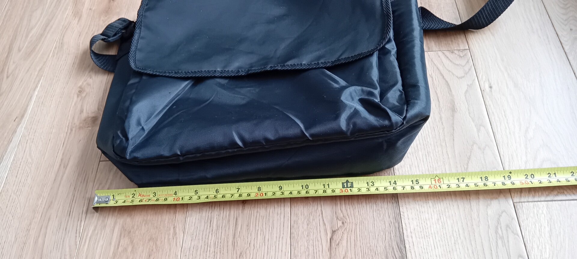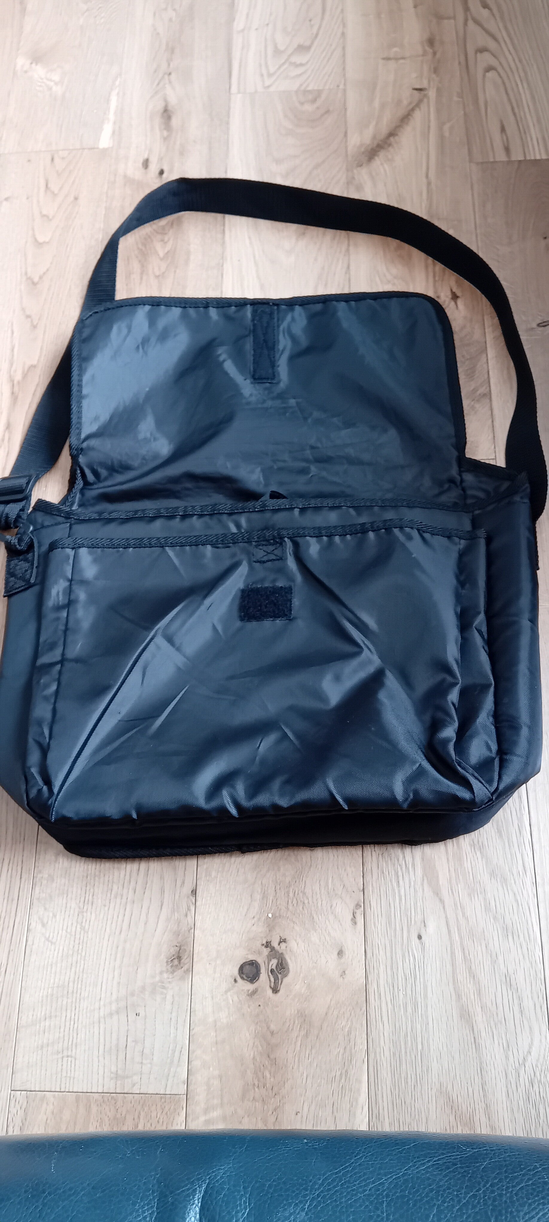Super shoulder carry bag/lap top holder with two large pockets, ideal for all your personnel needs. It has velcro straps to keep pockets closed, also comes with adjustable shoulder strap. In good used condition with some minor wear from use. See photos to make your own assessment of condition. I believe the bag material is plastic/vinyl but not 100% sure