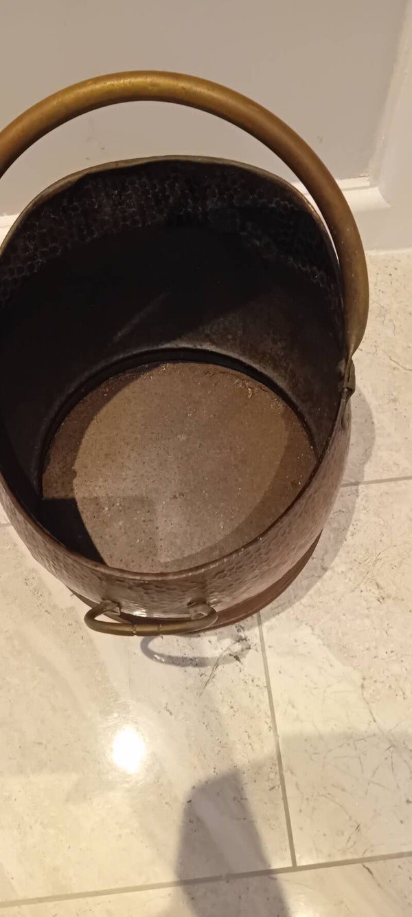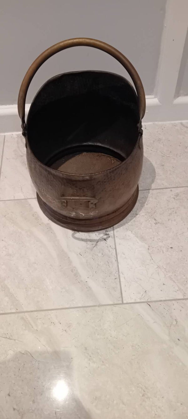 Super coal/wood scuttle never tried to.clean as I like its old patina. I believe it is made from copper ?as there appear to be some copper oxidation on it. There is some green paint splashes on it and some general wear. In used condition with lift up/down handle. See photos to make your own assessment of condition.