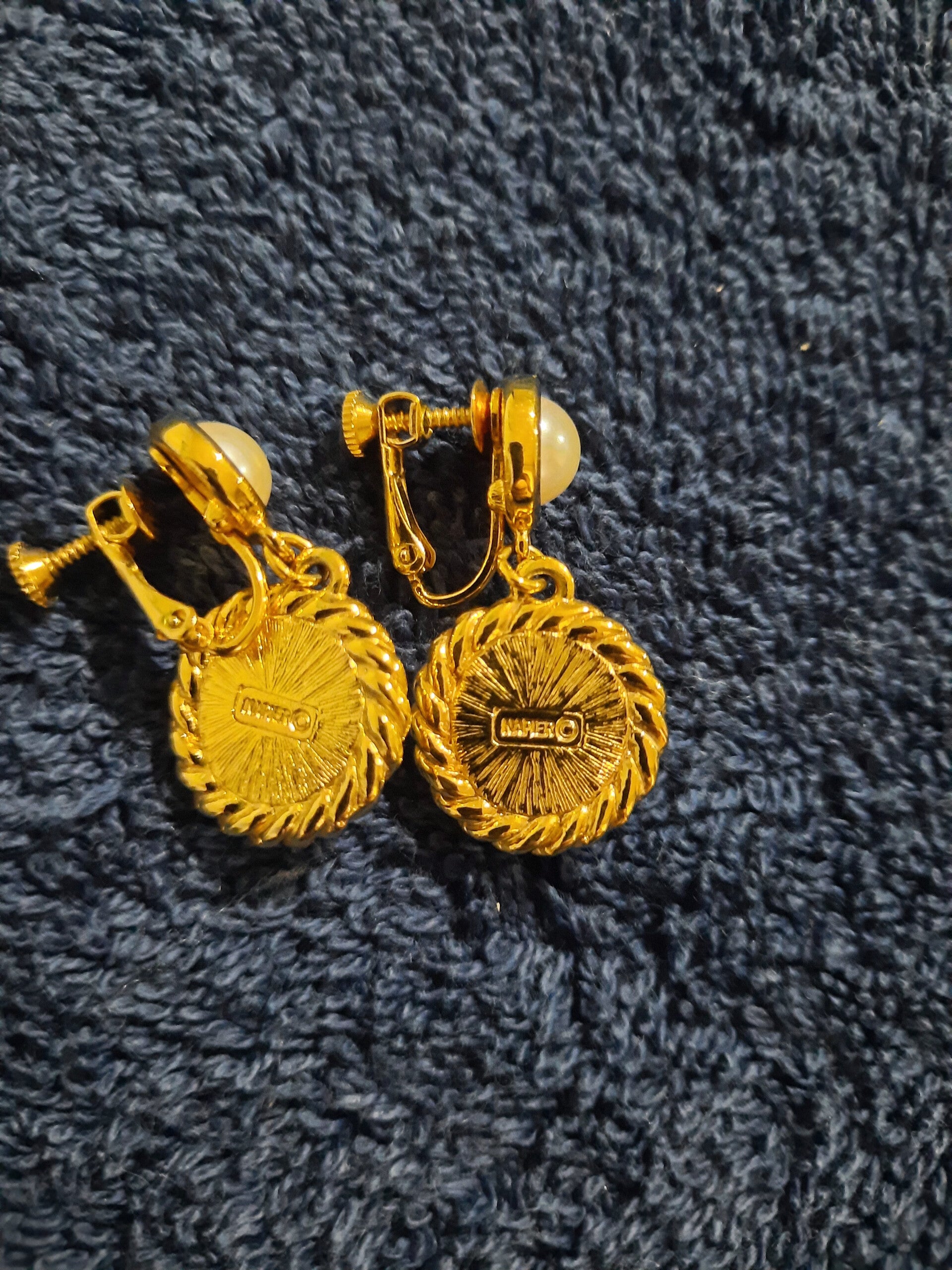 These are a set of Napier clip on screw tight gold tone earrings with silvertone centers . They're very pretty . Light weight for no painful pulling on the earlobes. Will look very nice with any type of clothing . Have a look at the pictures below and then take it home!!!🙂🙂🙂🙂🙂UK POSTAGE ONLY!!!
