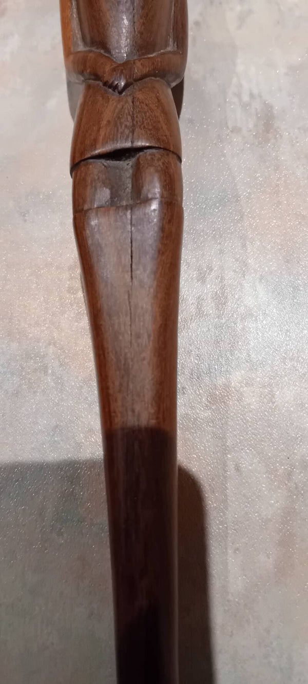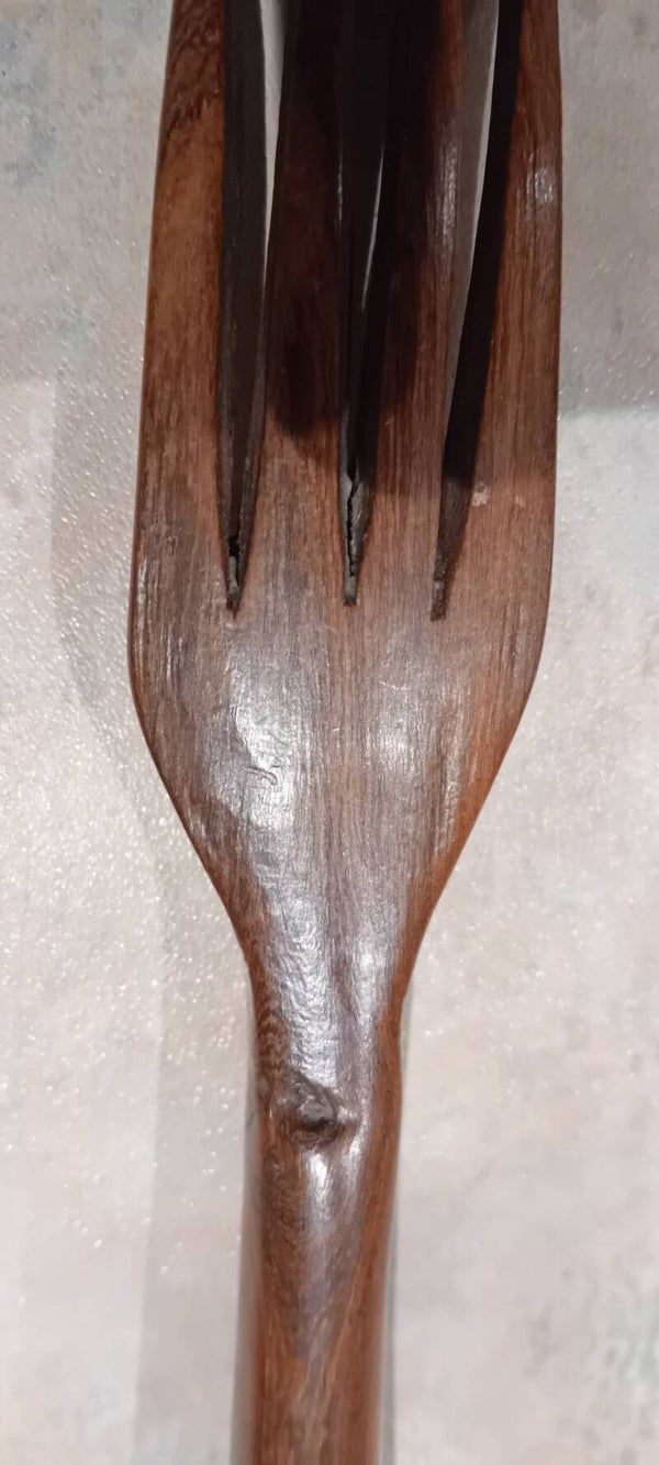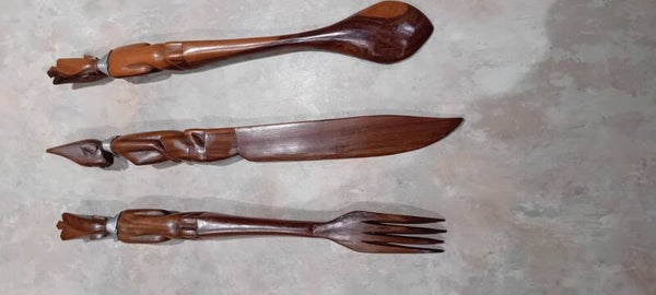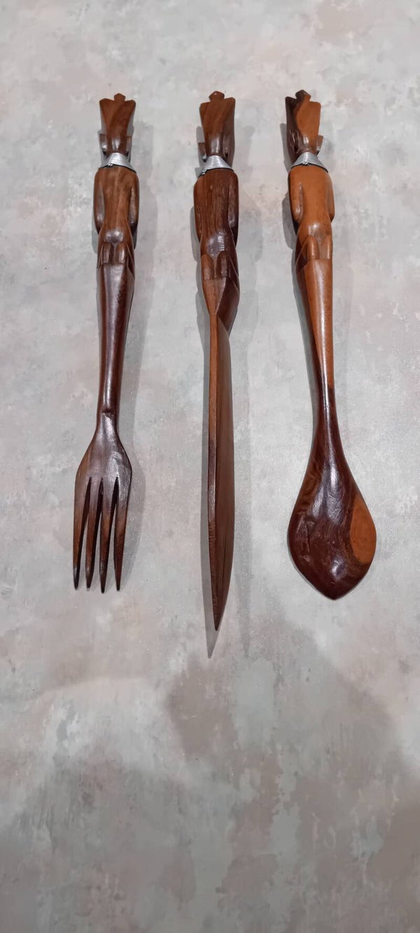 - I believe these stunning hand crafted wooden cutlery set with women wearing neck bands are based on some African women who wear these as part of their culture. They comprise of a fork, knife, and spoon. In good used condition with some minor wood chips/splits consistent to the material and use. See photos to make your own assessment of condition.
