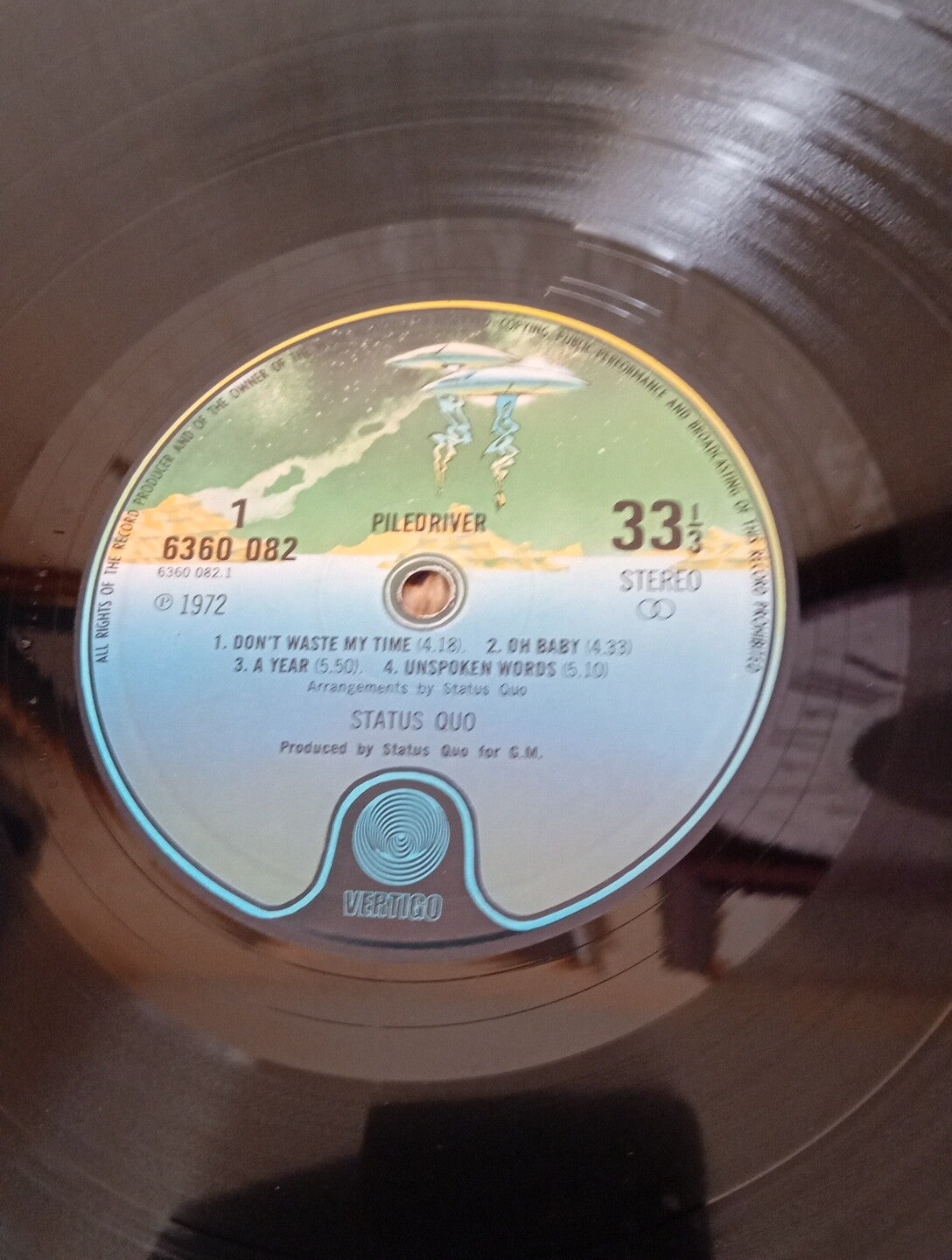 Iconic Band Status Quo LP vinyl PILEDRIVER in very good used condition plays well NO SKIPS OR JUMPS. Outer sleeve does have some smudges from use and considering album is over 50 years old its in fair condition. Inner sleeve does have some wear/fading and some pen writing on it. See photos to make your own assessment of condition.