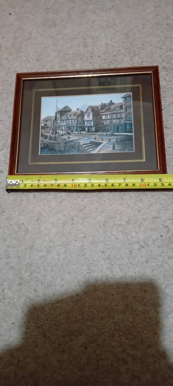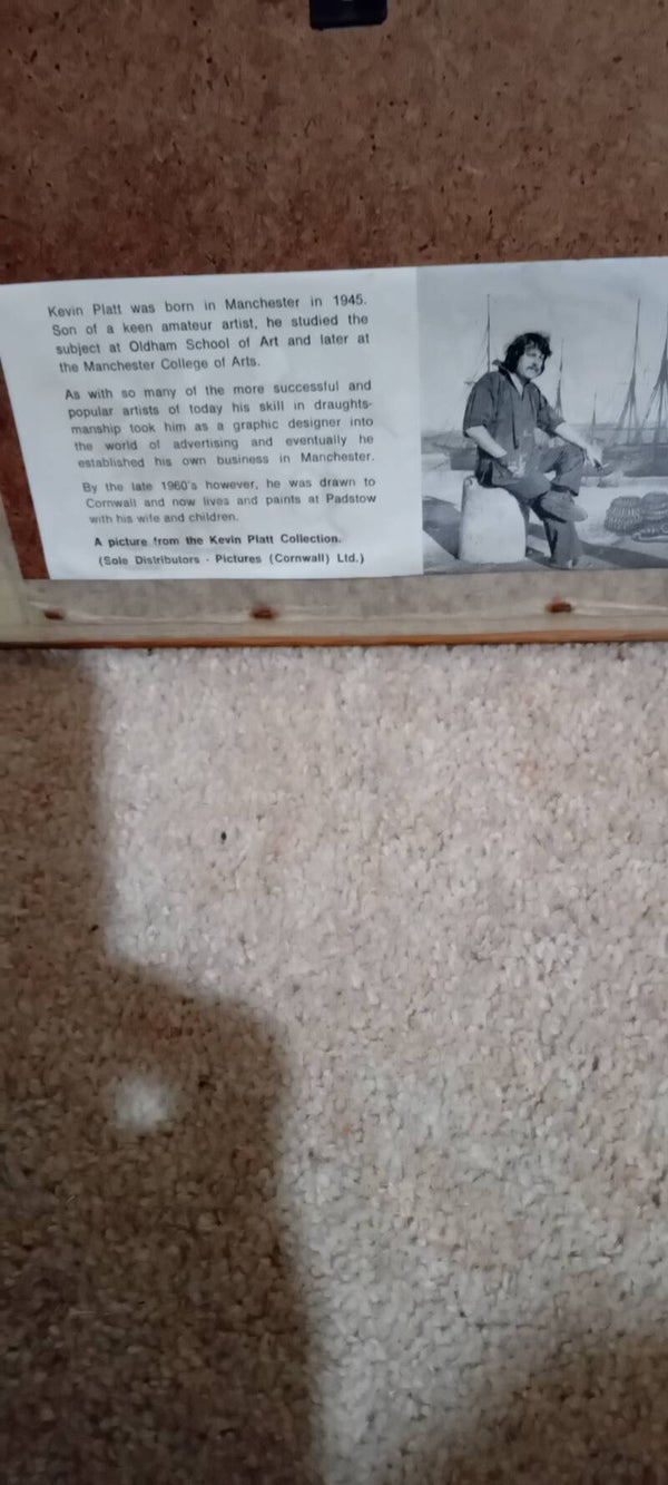 Lovely picture print of a harbour view. The artist name is Kevin Platt and is written on the picture. I believe this picture is of Padstow in Cornwall but not 100% sure There is an interesting leaflet on the back of picture with reference to Kevin Platt. In good used condition with some minor wear consistent to its age and use. See photos to make your own assessment of condition.
