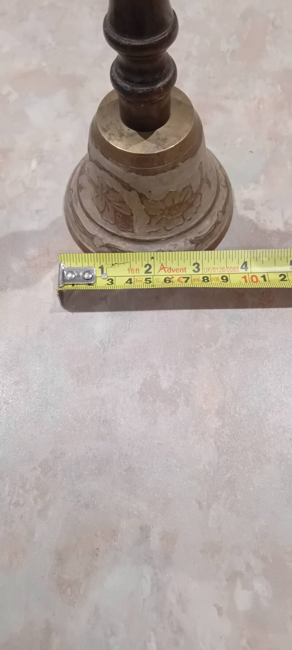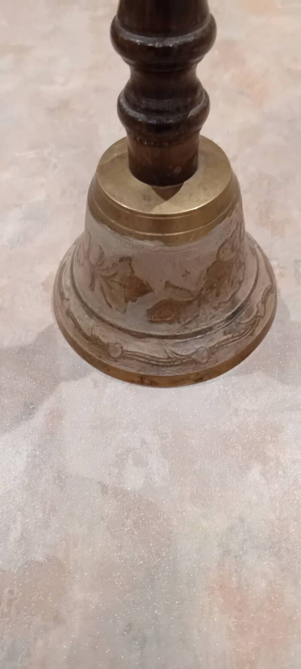 Very nice sturdy decorative bell with tactile wooden handle . The bell has a strong tone to it, ideal for catching the attention of people. In good used condition with some minor wear consistent to its age and use. See photos to make your own assessment of condition.