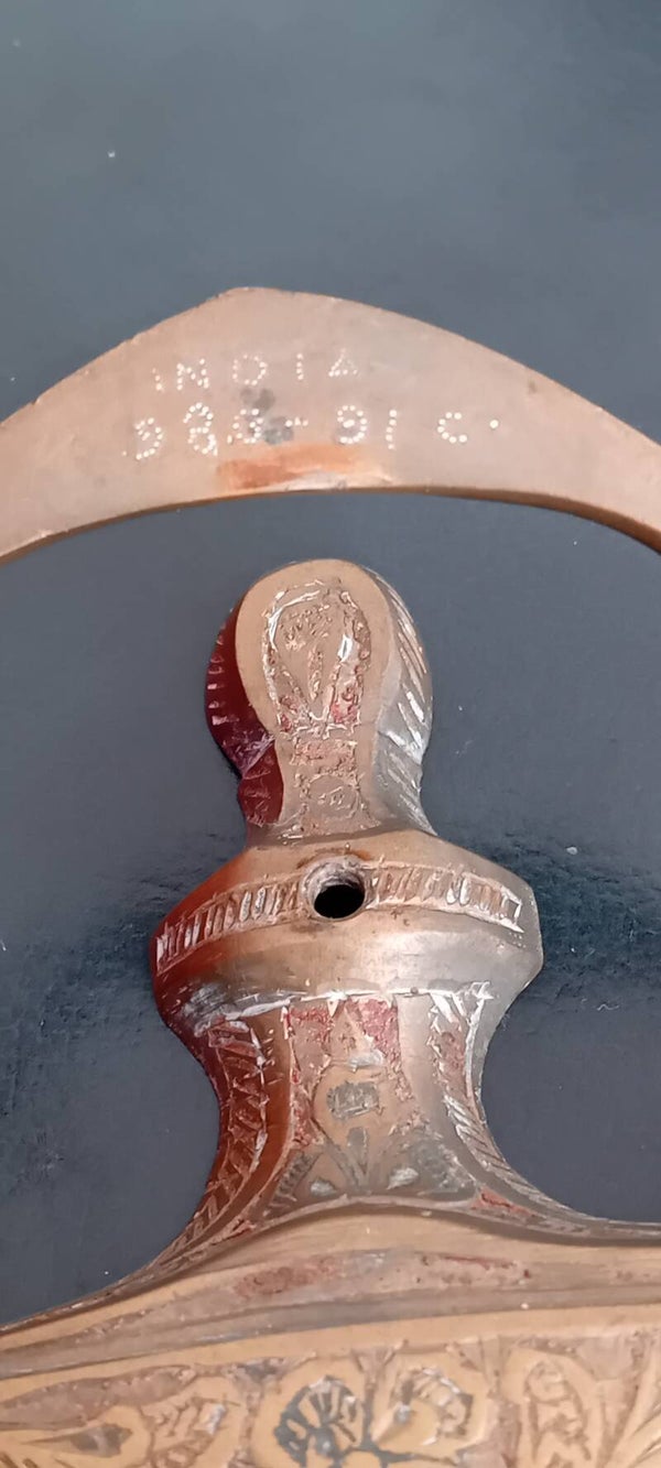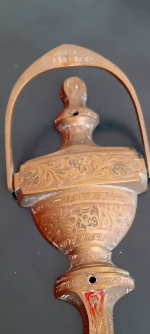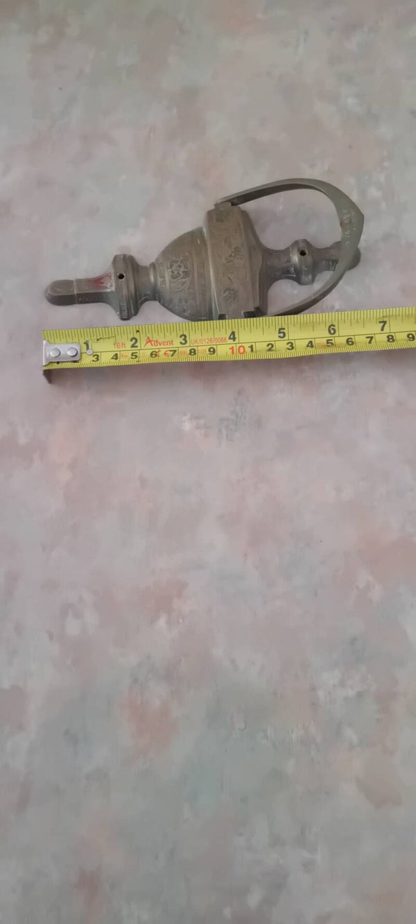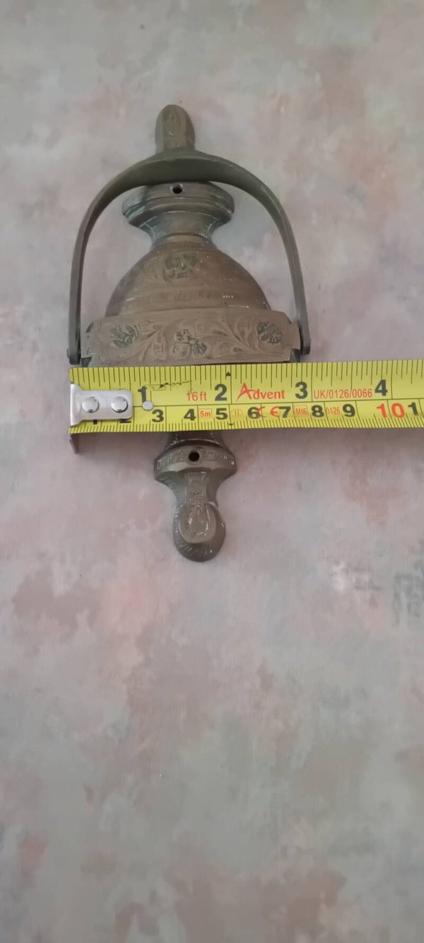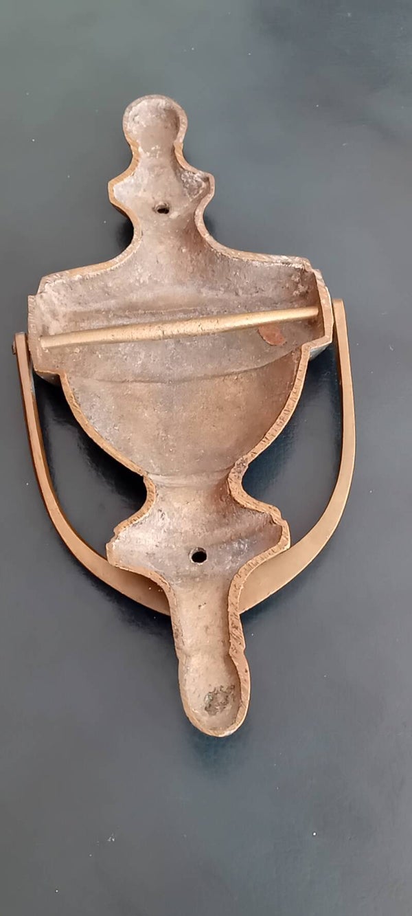 A stylish ornate door knocker, I have never tried to polish it as I like its old patina look but the choice is yours. It has two holes for door attachment, but does NOT come with screws easy to buy from your local DIY shop. In used condition with some wear consistent to its age and use. See photos to make your own assessment of condition.