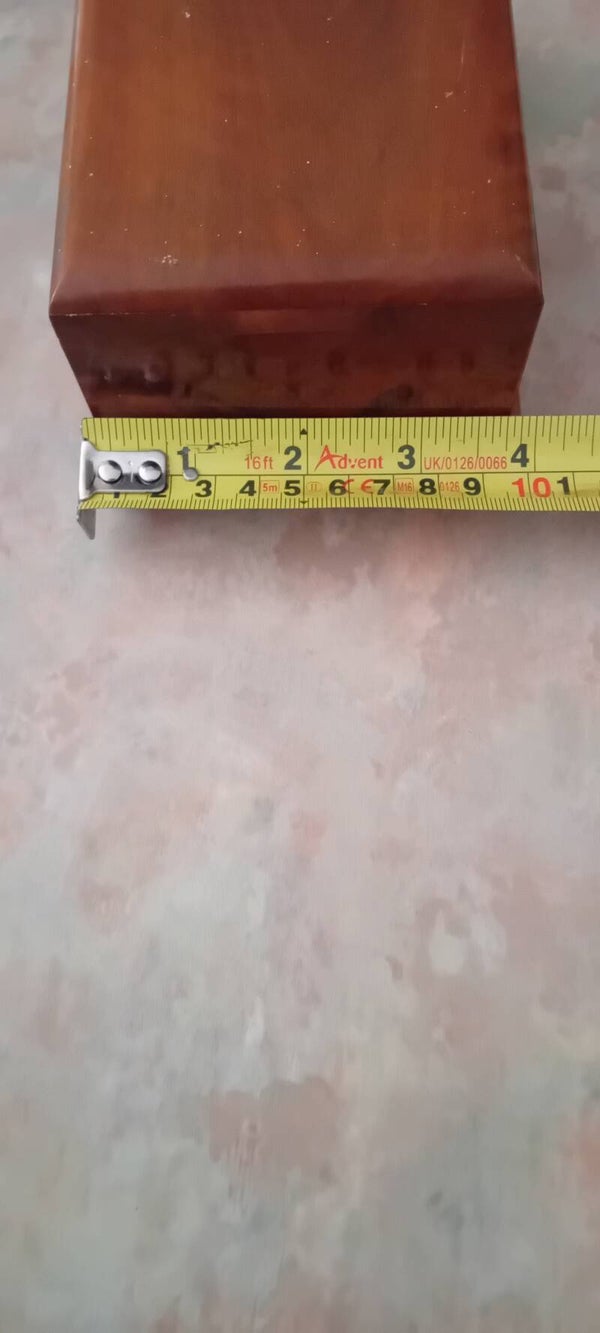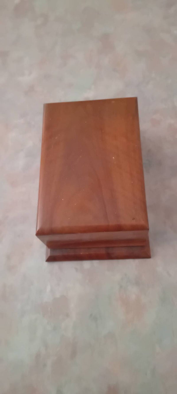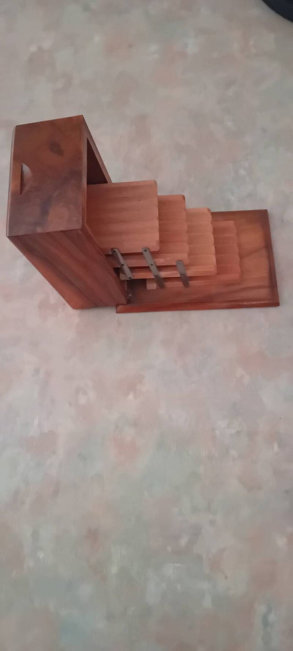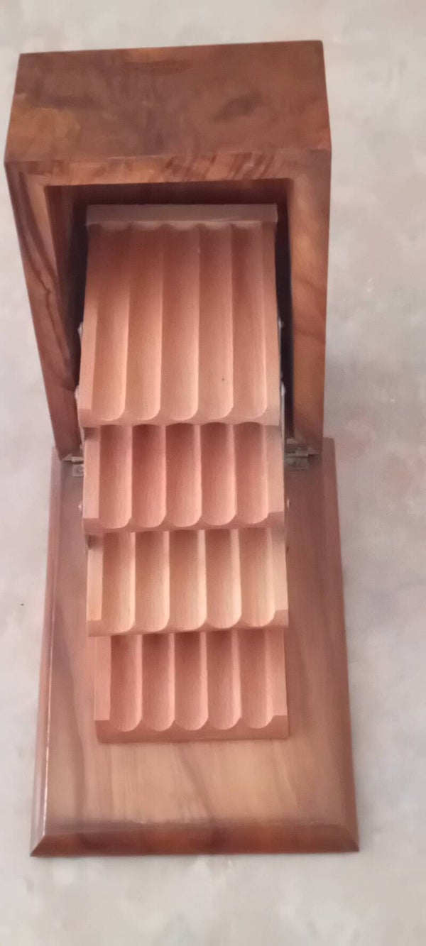 This is a very interesting wooden storage box, when it is opened it exposes 4 drop storage containers each one has 5 slots giving a total of 20 slots. I cannot be sure but I believe this was made for cigarette storage, but could be used for other small items. In good used condition with some wear consistent to its age and use.