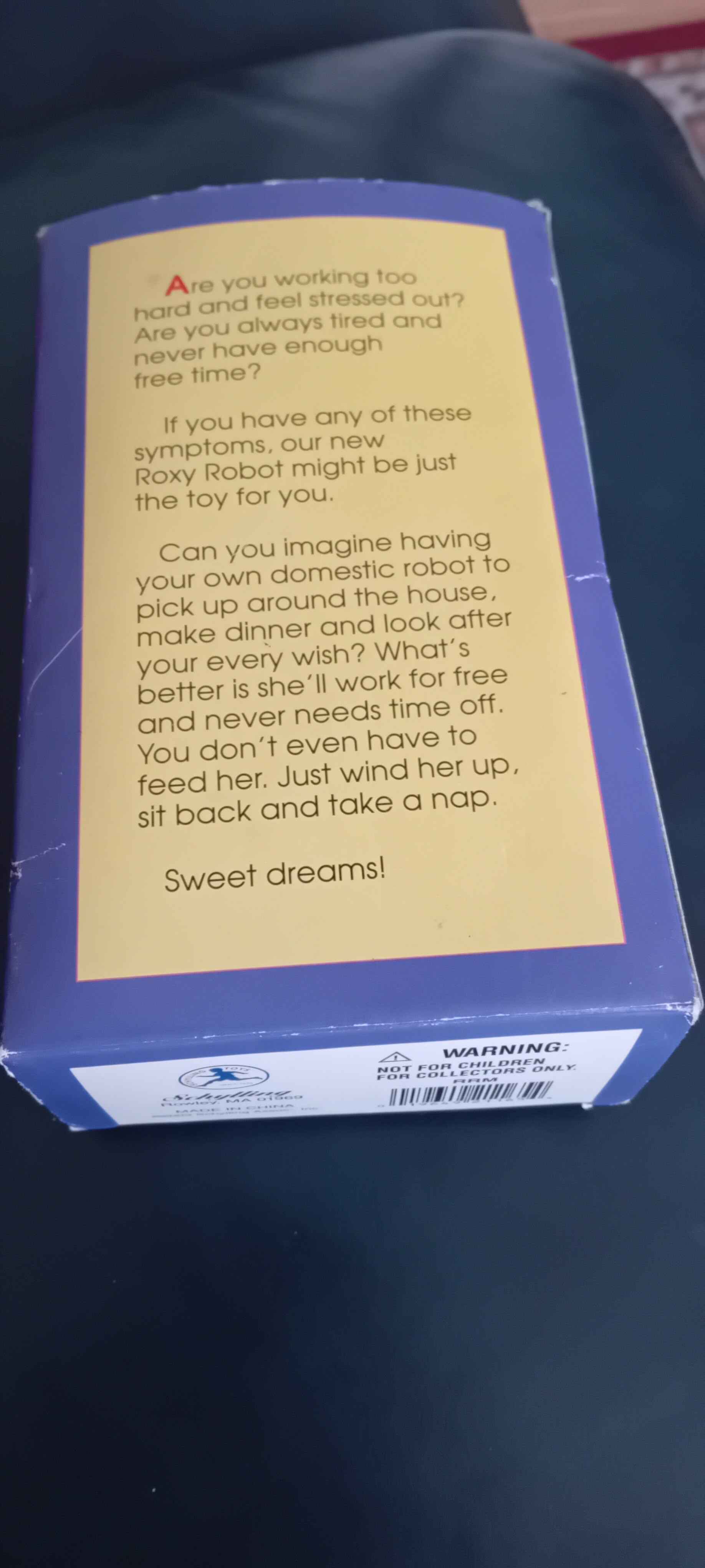 Definitely one for the collector of mechanical wind up robot. Here you have the opportunity to acquire this ROXY ROBOT in full working order to your collection. In excellent used condition with some minor wear consistent to its age and use. The box is in good used condition with minor shelf wear. See photos to make your own assessment of condition. NOT FOR CHILDRENS USE.