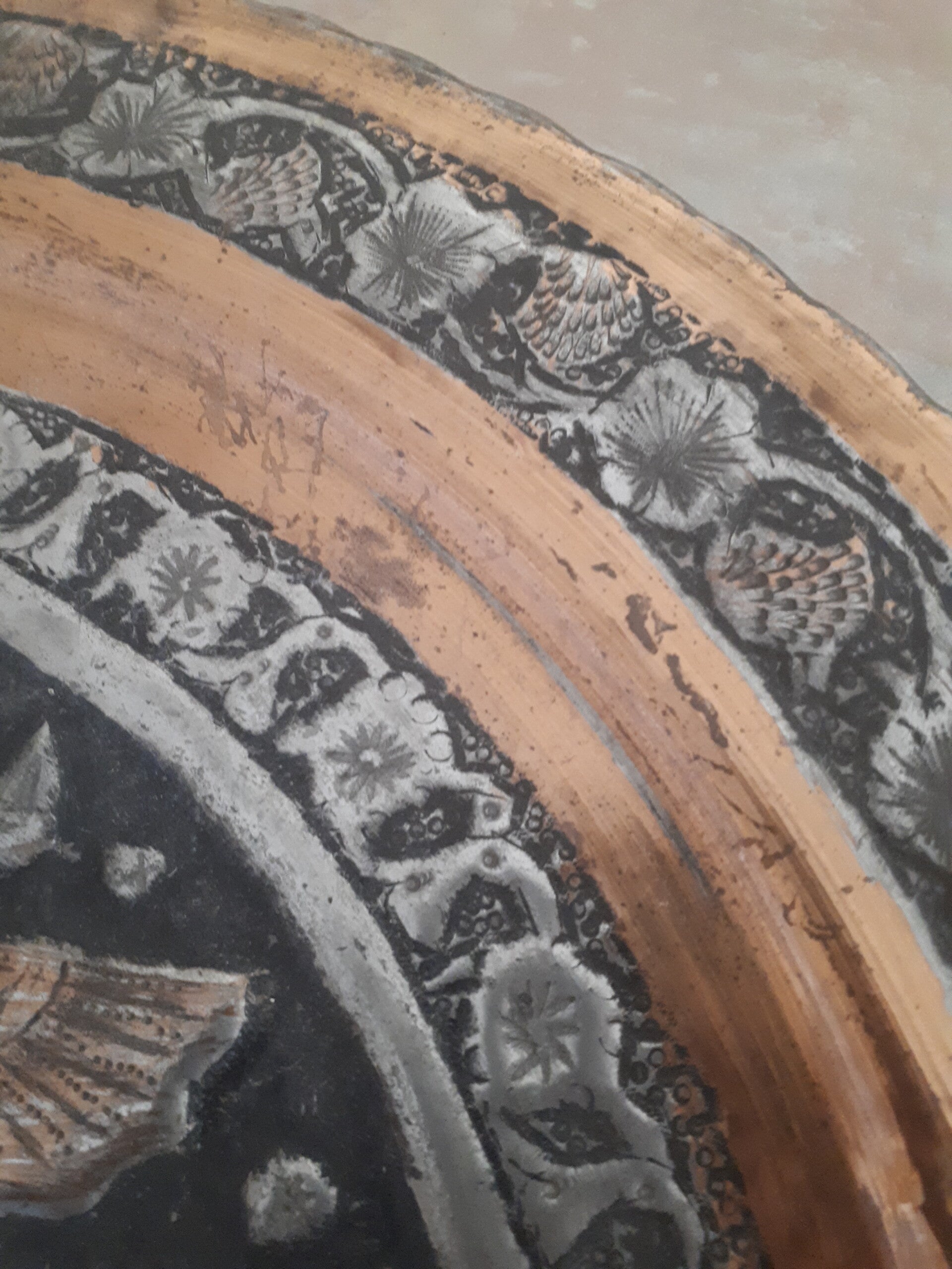 Beautiful Plate/Tray with ornate design and what may be persian men in the centre of plate.Very strong and weighs in at 3lbs. In used condition does have some wear on the gold/copper effect surround, in my opinion adds to its patina. See photos to make your own assessment of condition.