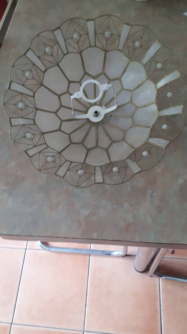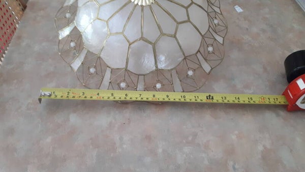 This light shade would look lovely in any home. I beleive the inserts around the shade are sea shell but can't be 100% sure. In used condition see photos for your assessment of condition.