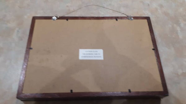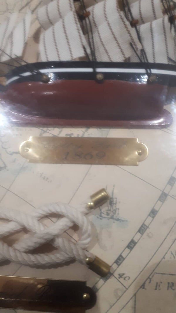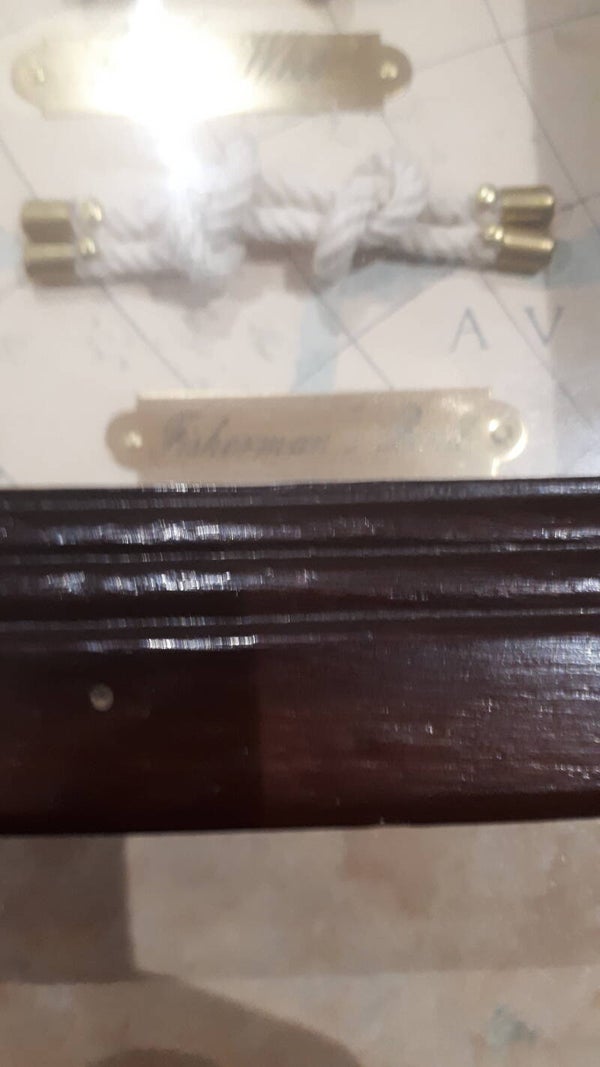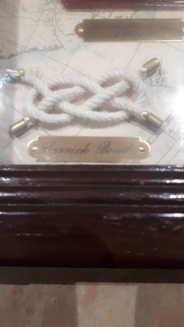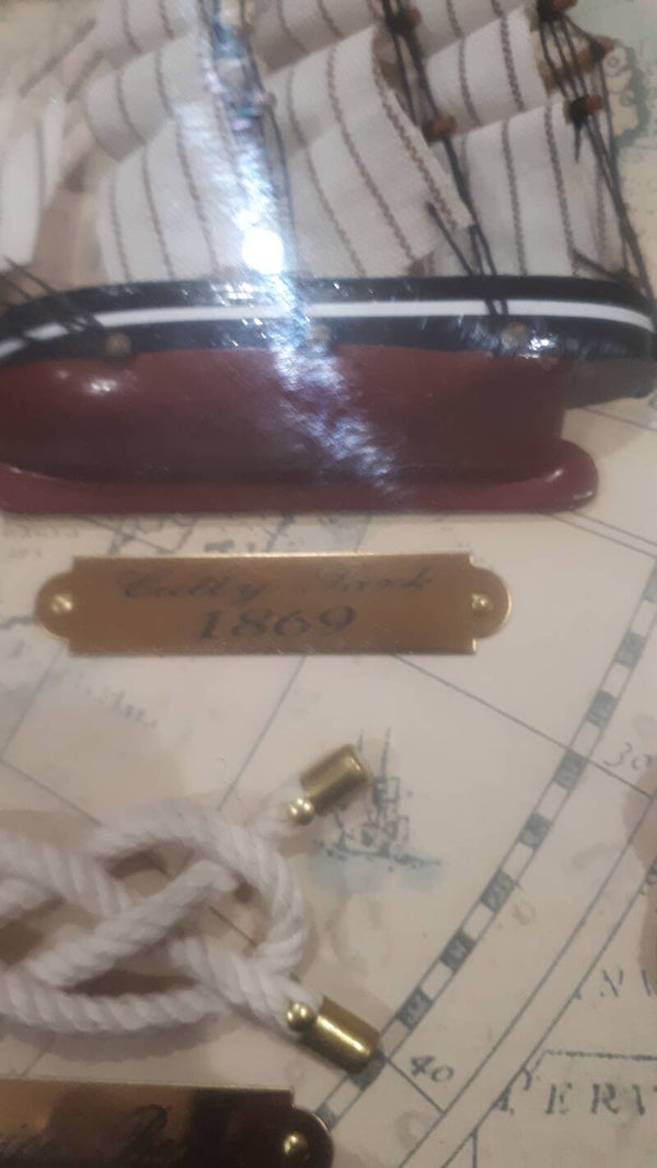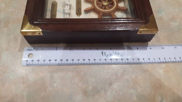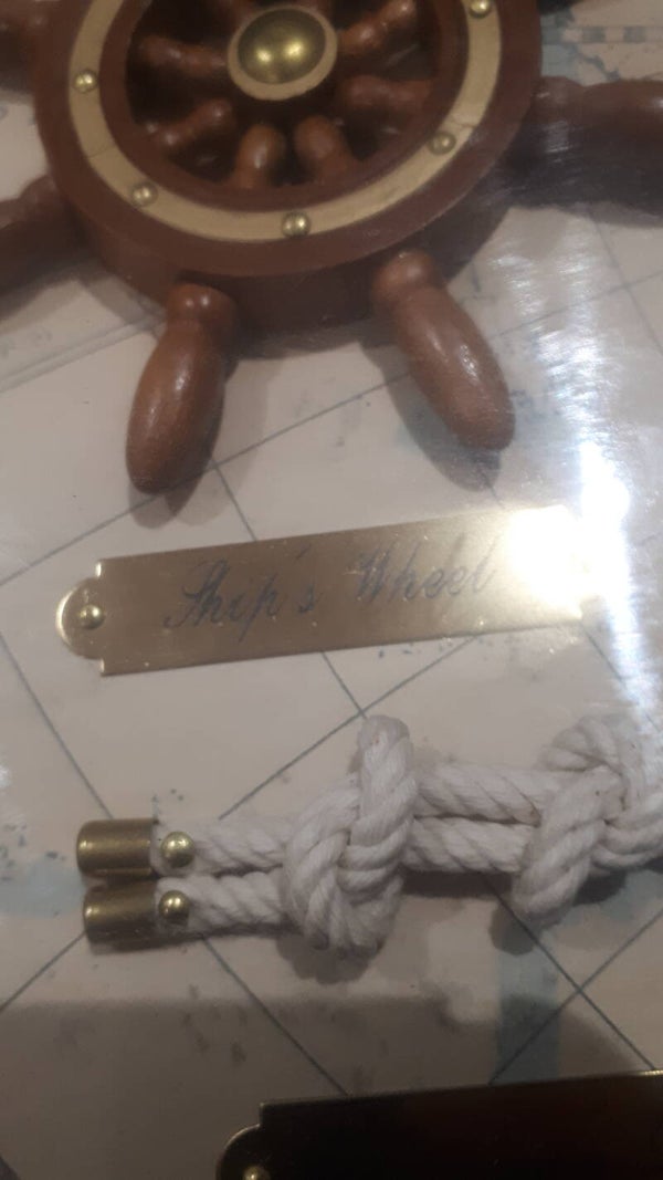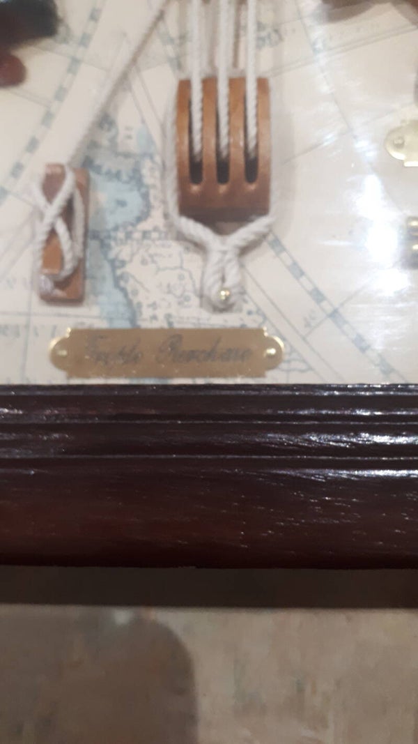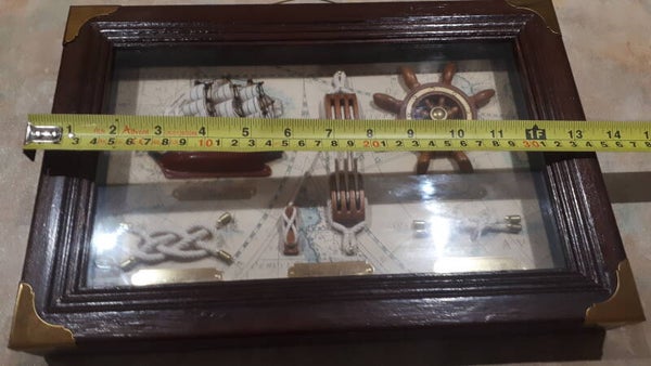 - Definetly one for the nautical minded, nice wooden framed box with brass corner ends. Inside the box are a ship (cutty sark) various ropes/pulley and ships wheel. Each one is identified with a brass plaque. Wire hanging bracket at back. In good used condition with some minor wear consistent to its age and use. See photos to make your own assessment of condition.