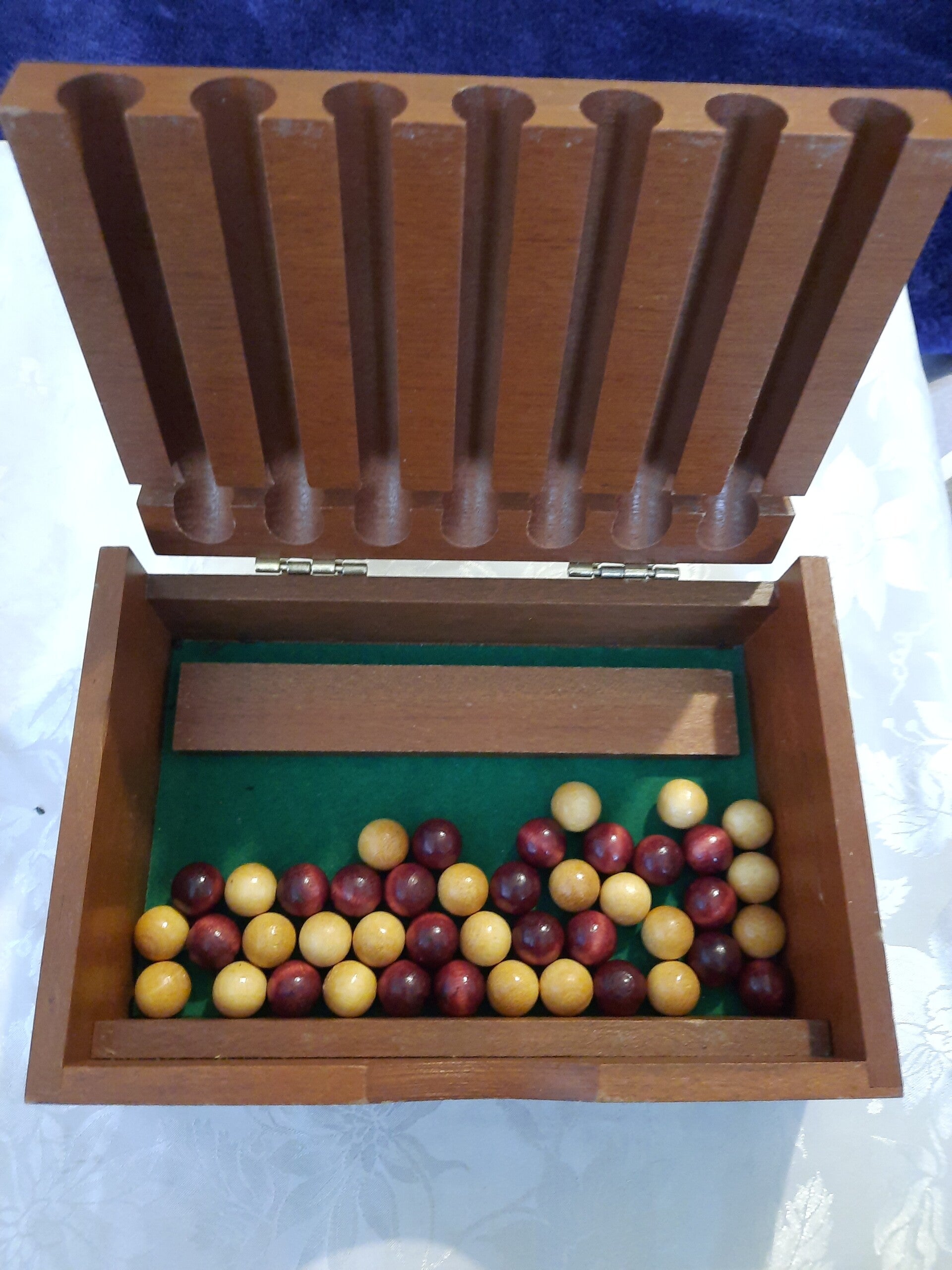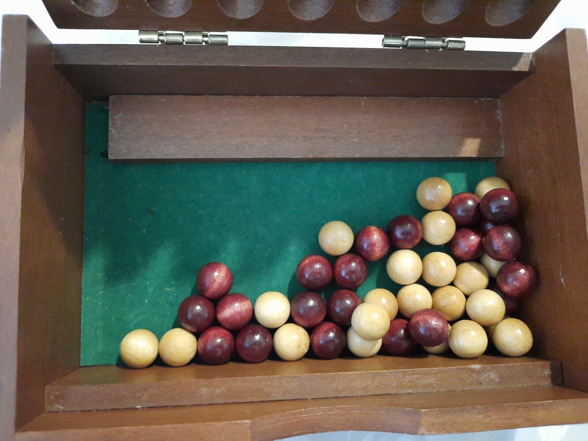 This is an all wood Game, it is used and in good condition, it has some scratches from age and wear . It doesn't have the instructions but they're easily found online! The balls are all wooden and there are 2 colours , white and brown . There are 44 balls and a plank . You put the plank into the board to stop the balls from falling through then choose your colour and the objective is to try to get 4 in a row of your colour when you've done that you've won the game . Remove the plank and start again . Very fun game . Have a look at the pictures then take it home!!!🙂🙂🙂🙂🙂