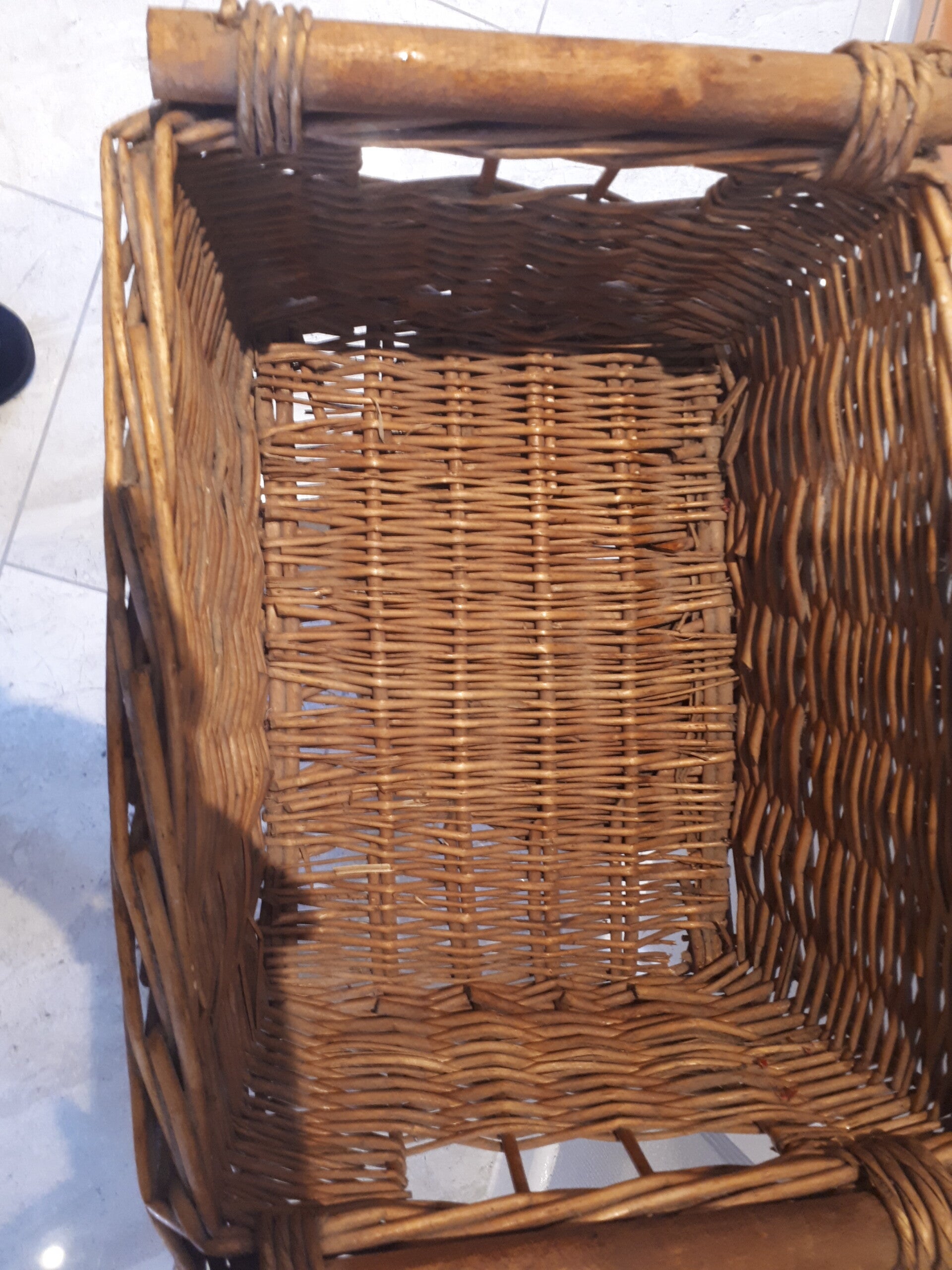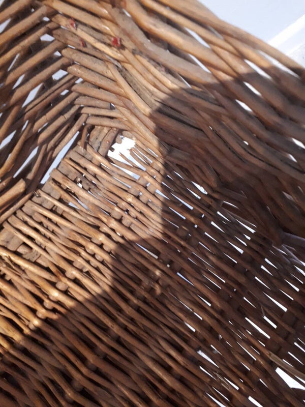 - In good used condition with minor wear and some splitting of the wicker at base in my opinion hardly worth mentioning. Has two wooden handles and finger holes at the top. Also will need a good dust between the wicker. See photos to make your own assessment of condition