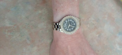 Stunning ladies quartz wrist watch with decorative clear beads around clock face. The watch is water resistant to 100ft and is in perfect working condition . To fit a lady with small wrist. See my photos of dimensions and wrist size. In very good used condition.