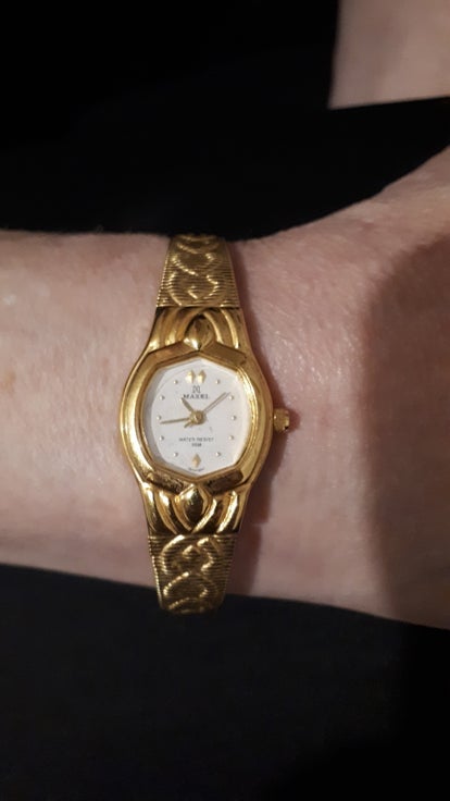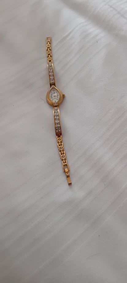 Stunning ornate gold coloured Ladies adjustable wrist watch. In very good used condition keeps excellent time. Water resistant to 30metres. Still has its original plastic cover over face of watch.